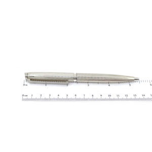 An engine turned ballpoint pen crafted from 925 English hallmarked sterling silver, combining smooth writing performance with a refined and understated engraved finish.