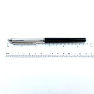 A rollerball pen with black leather and a diamond set clip, crafted from 925 English hallmarked sterling silver, offering smooth writing with a refined and distinctive finish.