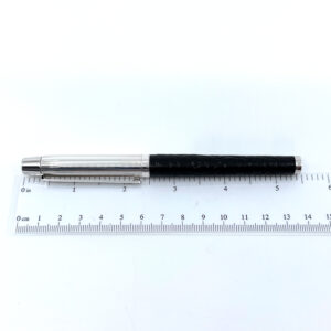 A fountain pen with black acrylic and an engine turned finish, crafted from 925 English hallmarked sterling silver, offering smooth writing with a refined and contrasting design.