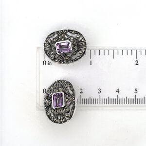 Victorian style clip on earrings set with amethyst and marcasite, combining traditional design with precise craftsmanship and a balanced, decorative finish.