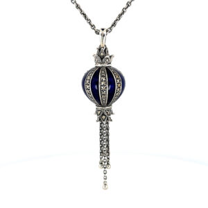 An Elizabethan style balloon shaped necklace featuring blue enamel and marcasite detailing, designed with bold proportions and a refined surface finish for a distinctive and composed appearance.