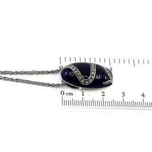An Elizabethan style necklace handcrafted in hallmarked sterling silver, featuring a blue enamel pendant with marcasite detailing and suspended from an adjustable decorative chain.