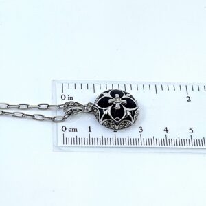 An Art Deco style necklace handcrafted in hallmarked sterling silver, featuring black enamel, a pearl, and crystal accents arranged in a balanced geometric pendant design.