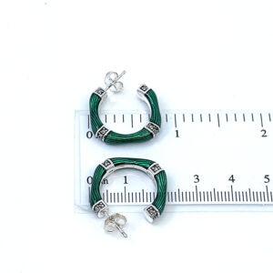 Bamboo style half hoop earrings set with green enamel and marcasite, combining natural-inspired design with precise craftsmanship and a structured, vibrant finish.