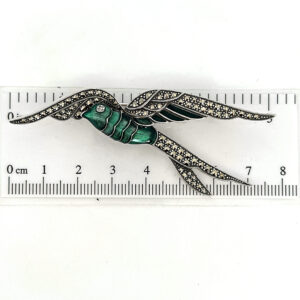 A swallow pin brooch decorated with green enamel and marcasite stones. The graceful bird design and refined sterling silver craftsmanship create a decorative jewellery piece with natural elegance.