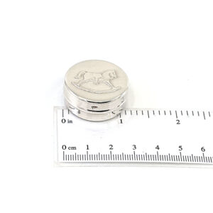 A round rocking horse motif pill box in 925 English hallmarked sterling silver, featuring an embossed lid design and a hinged interior compartment.