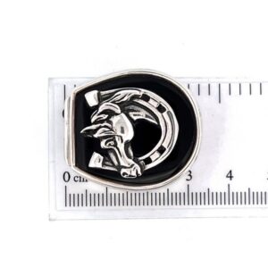 A horseshoe shaped pill box in 925 English hallmarked sterling silver, featuring a sculptural horse head set against a polished onyx lid and a hinged interior compartment.