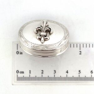 An oval pill box in 925 English hallmarked sterling silver, featuring a raised Fleur de Lys motif and engraved border detailing with a hinged interior compartment.