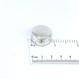 A small plain round pill box in 925 English hallmarked sterling silver, featuring a polished hinged lid and compact circular form for secure and discreet storage.