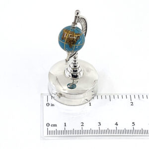 A round pill box in 925 English hallmarked sterling silver, featuring a three-dimensional spinning globe and a hinged interior compartment.