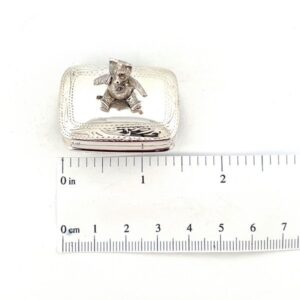A teddy bear shaped pill box in 925 English hallmarked sterling silver, featuring a hinged interior compartment within a sculptural decorative form.