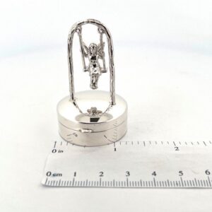 A pill box in 925 English hallmarked sterling silver featuring a three-dimensional fairy on a swing with a hinged interior compartment.