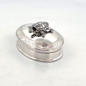 A pill box in 925 English hallmarked sterling silver featuring a three-dimensional moving tortoise with engraved border detailing and a hinged interior compartment.