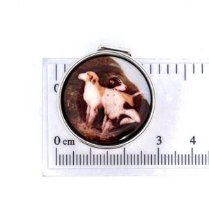 A hinged pill box featuring a hand painted enamel lid with a two dogs motif, designed with compact proportions and refined detailing for practical use and decorative appeal.
