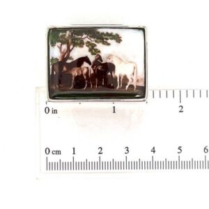 A rectangular hinged pill box featuring a hand painted enamel lid with a five horses motif, designed with balanced proportions and refined detailing for practical use and decorative appeal.