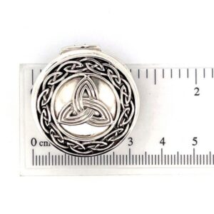 A round Celtic pattern pill box in 925 English hallmarked sterling silver, featuring an embossed knot motif and a hinged interior compartment for secure storage.