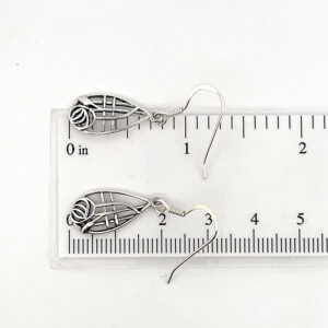 Mackintosh style teardrop earrings with stencilled floral design, combining openwork detail with a refined and balanced form.
