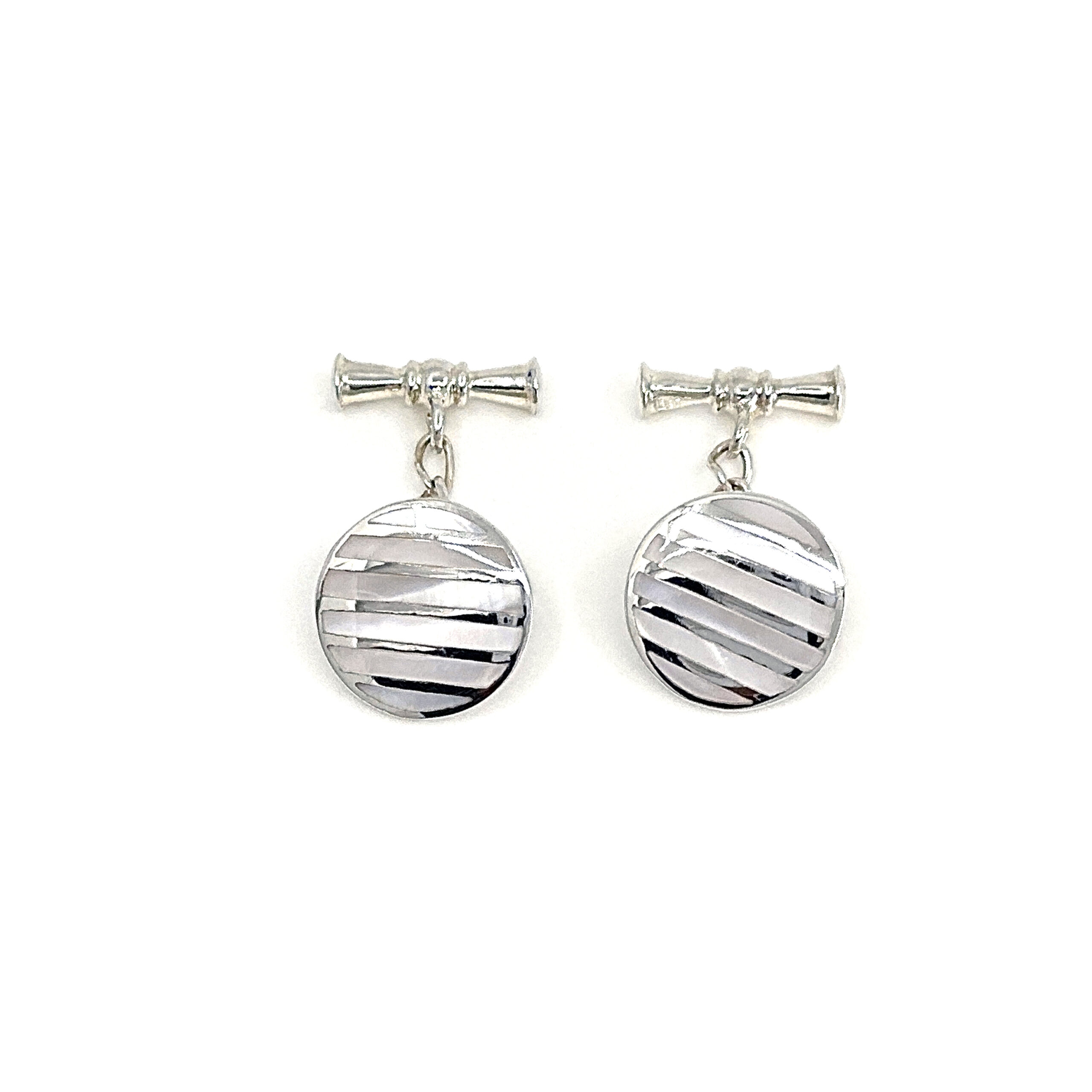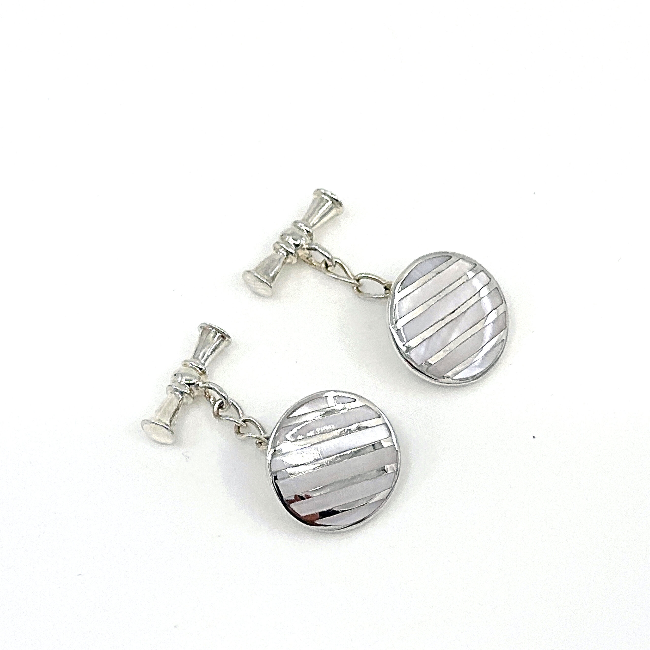 Crafted in England from 925 sterling silver and bearing English hallmarks, these cufflinks are carefully finished to achieve clarity in the striped detailing. The mother of pearl is securely set to preserve its natural iridescence while ensuring durability in use.