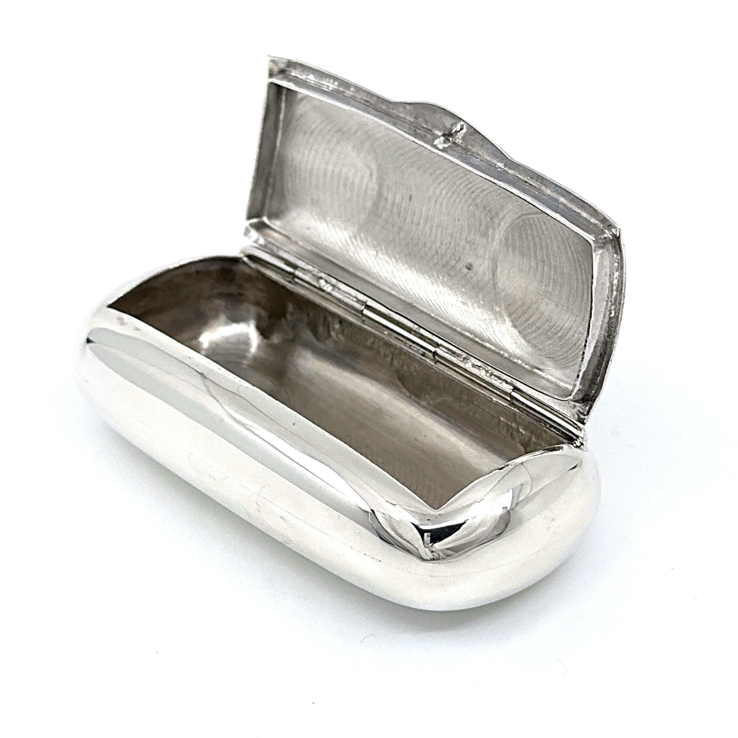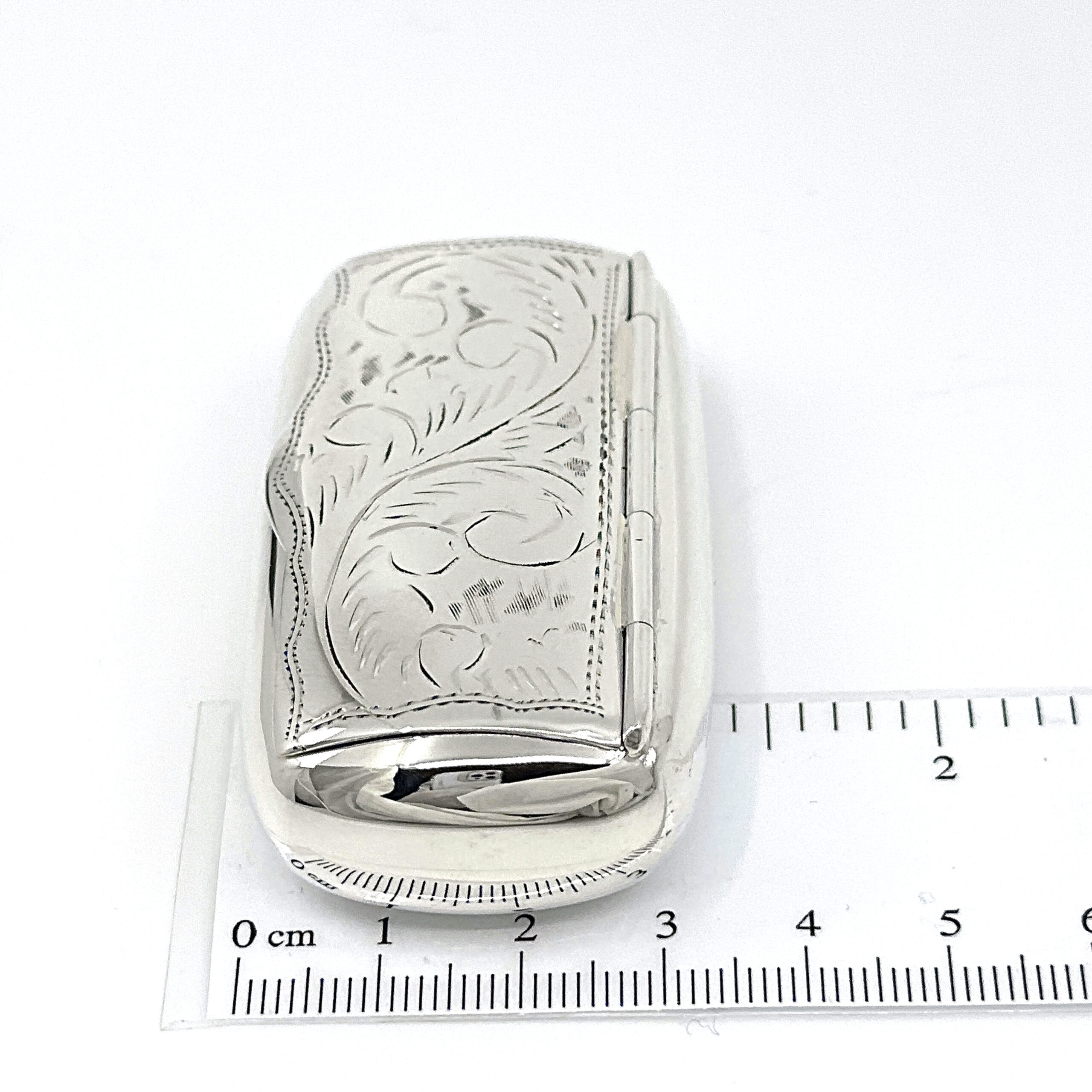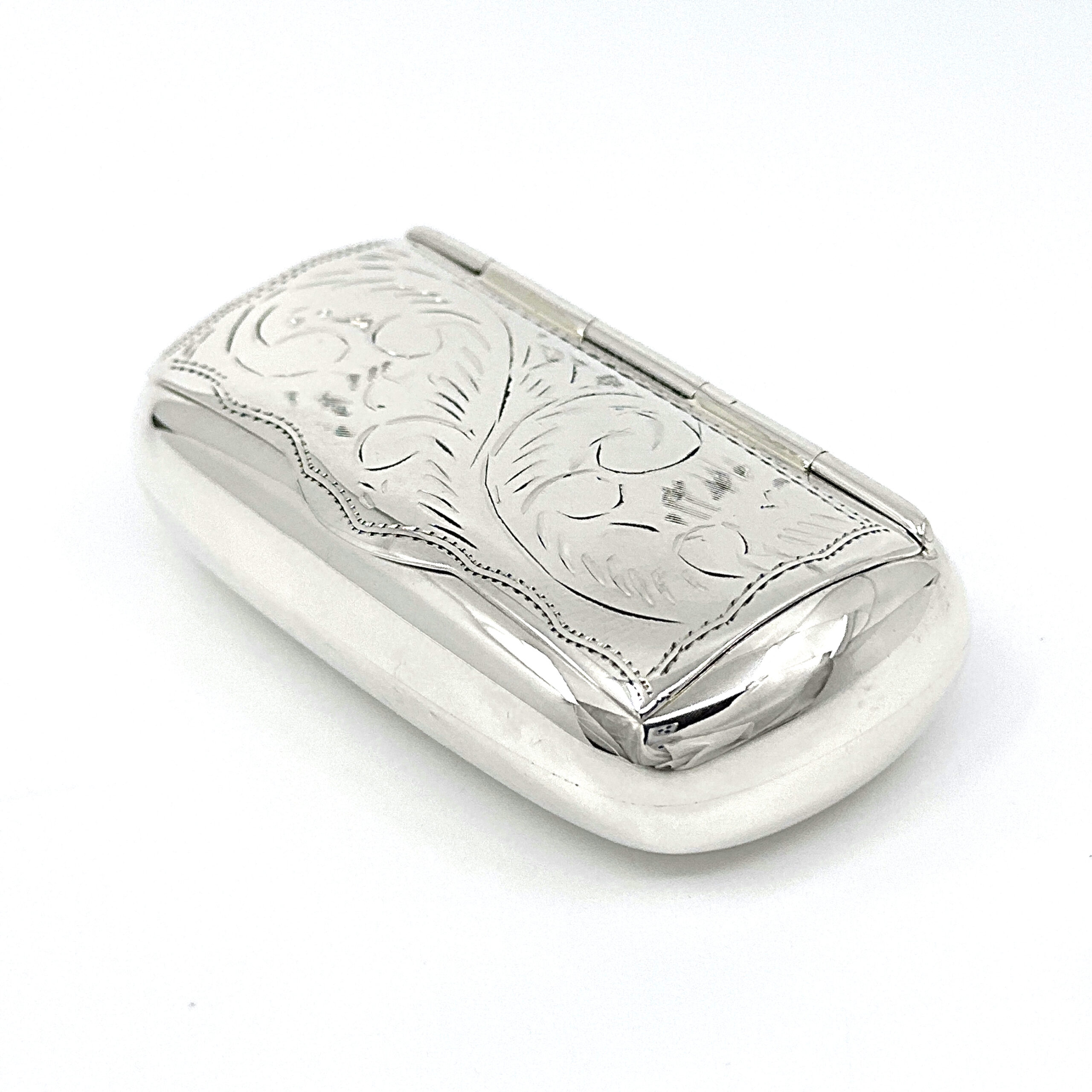 An engraved Victorian style pill box and snuffbox in 925 English hallmarked sterling silver, featuring a rounded rectangular form and decorative detailing.
