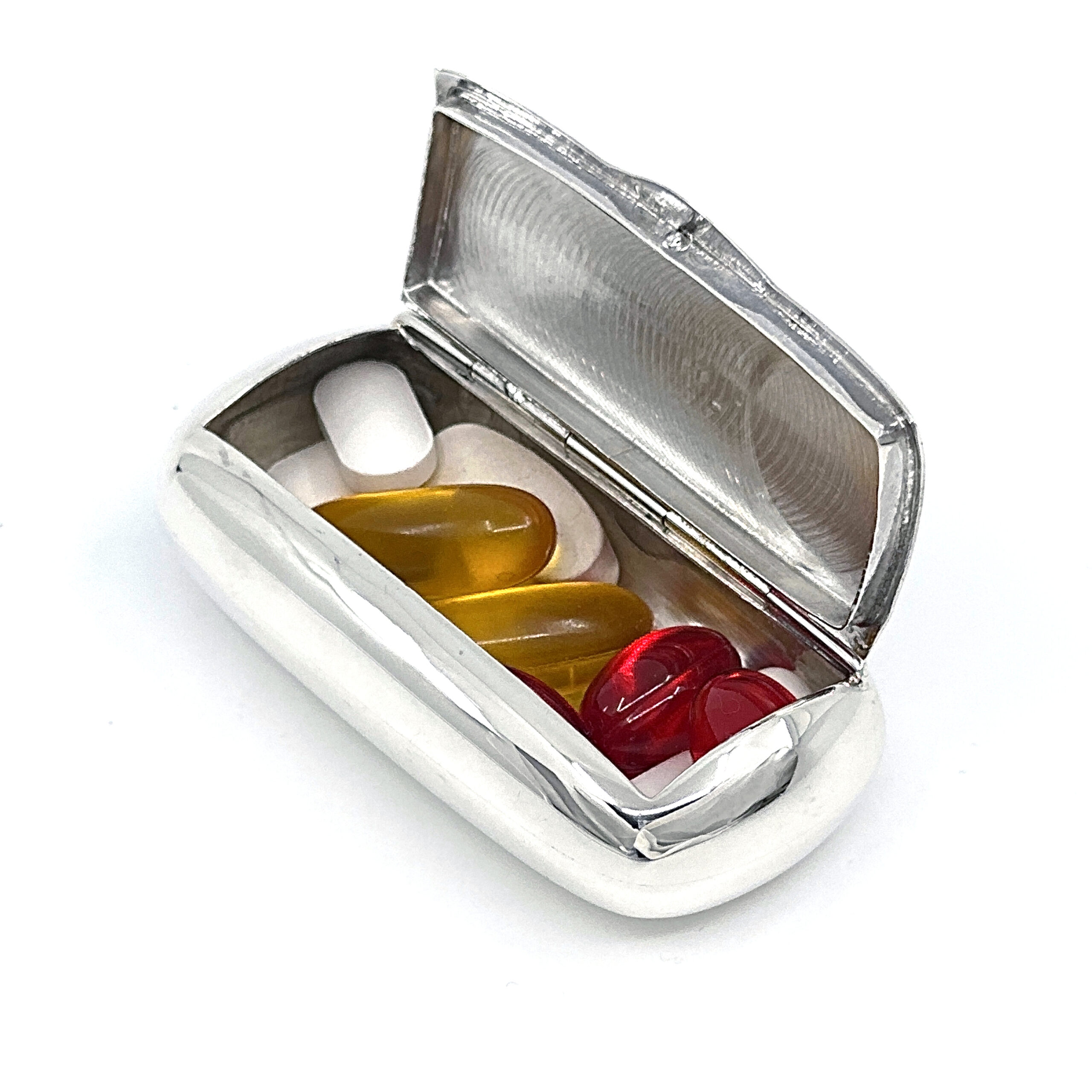 This engraved pill box is designed as a rounded rectangular hinged container for the secure storage of tablets, and may also be used as a snuffbox or small keepsake box. The surface is decorated with Victorian-style engraving, adding ornamental depth to the structured form.
