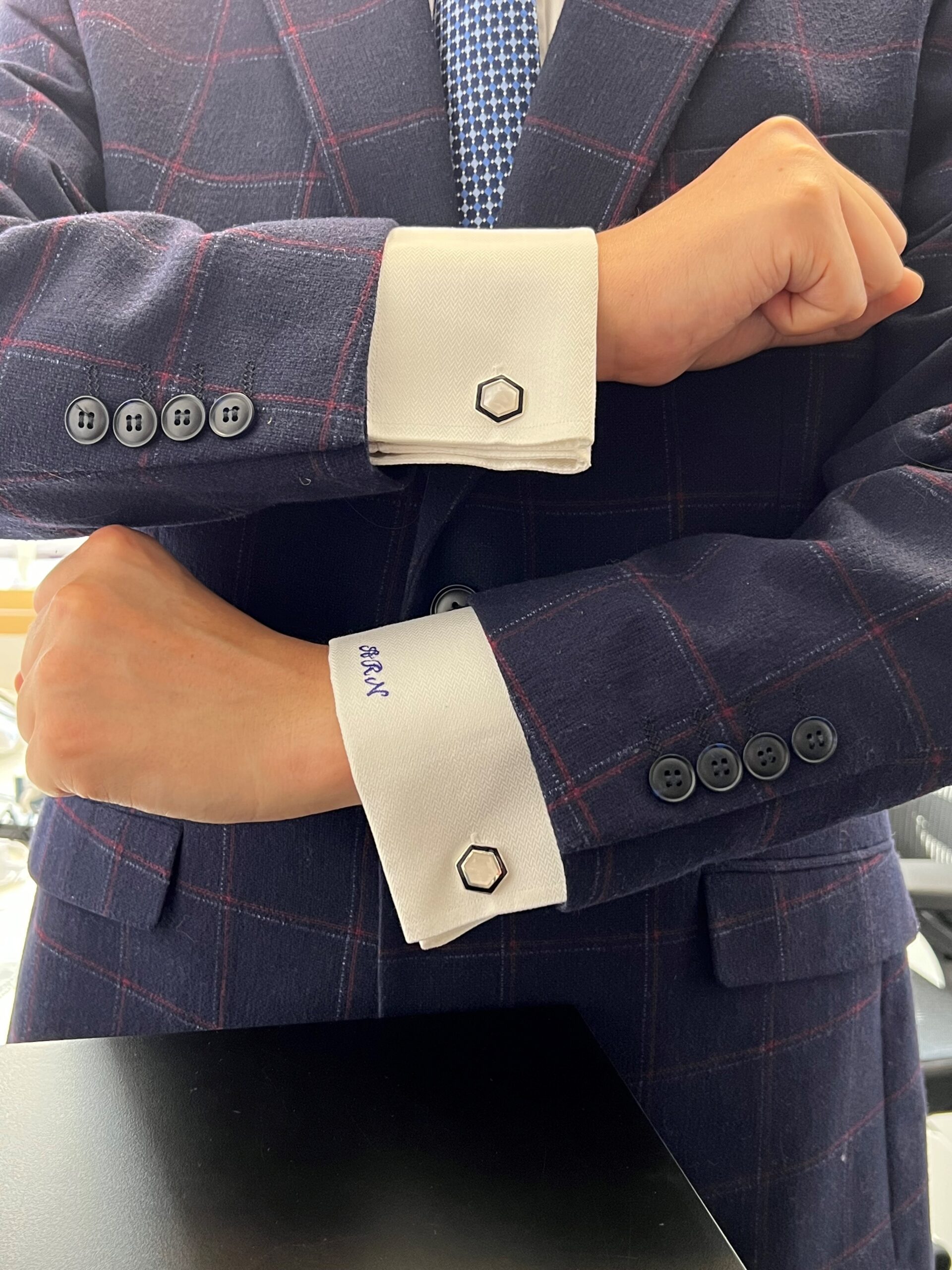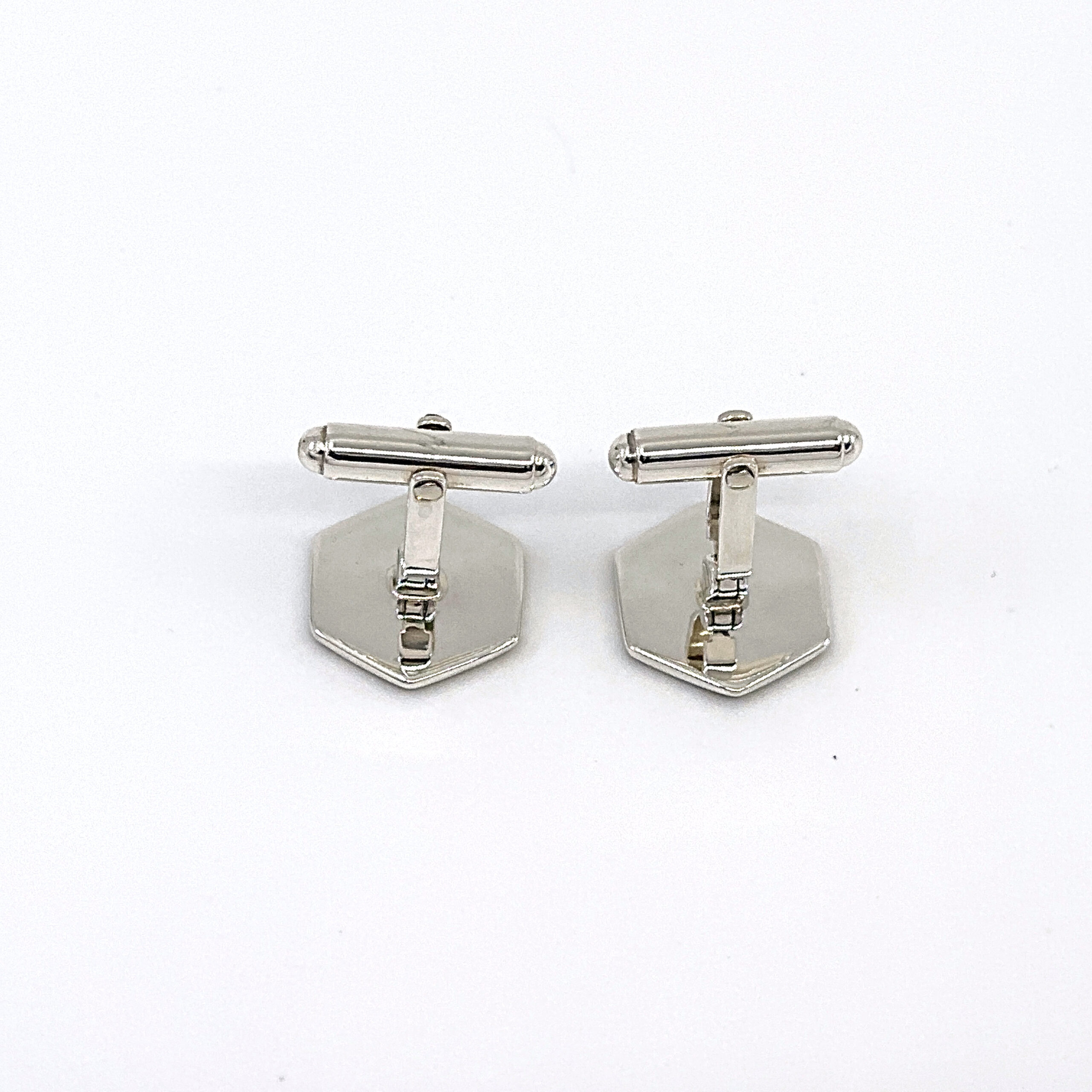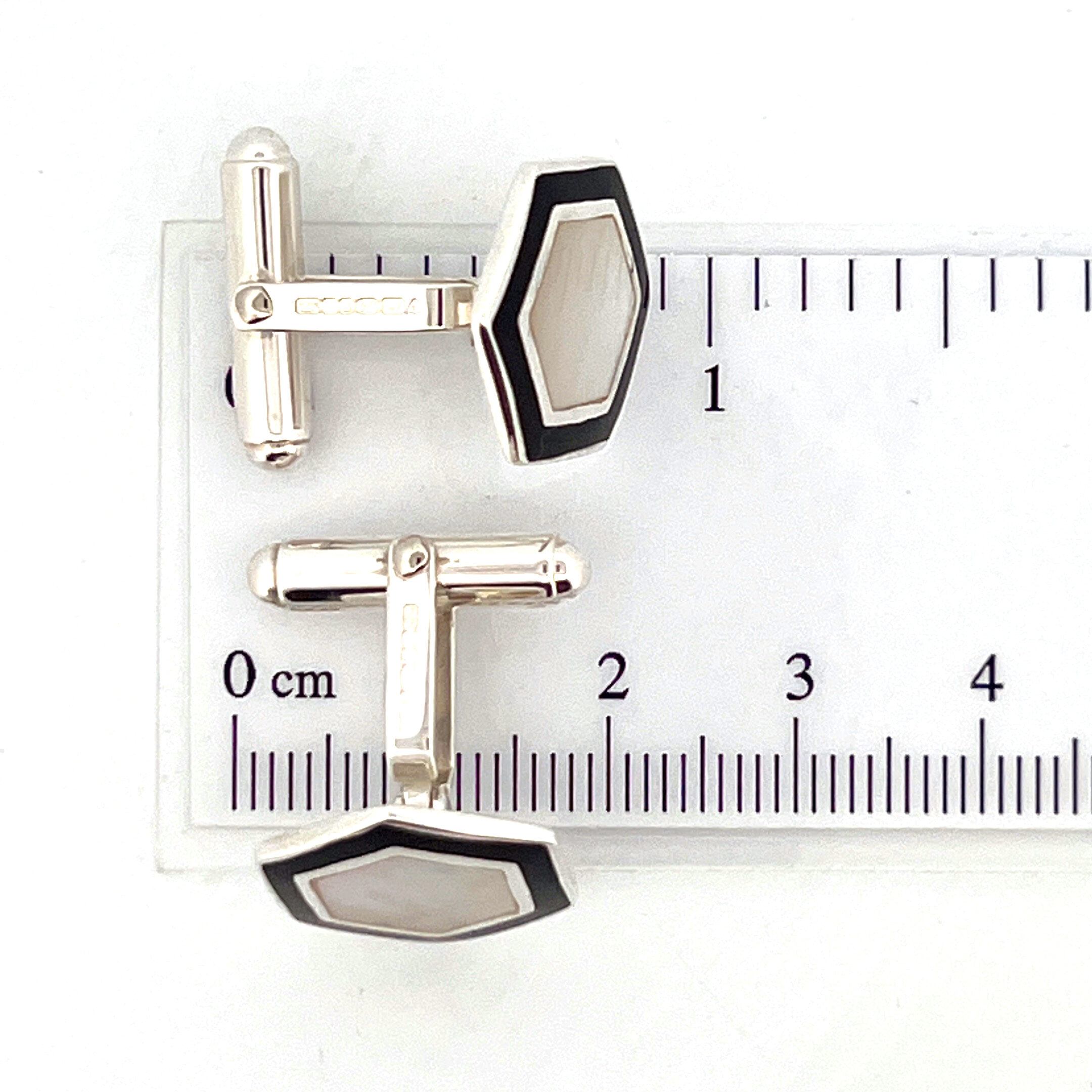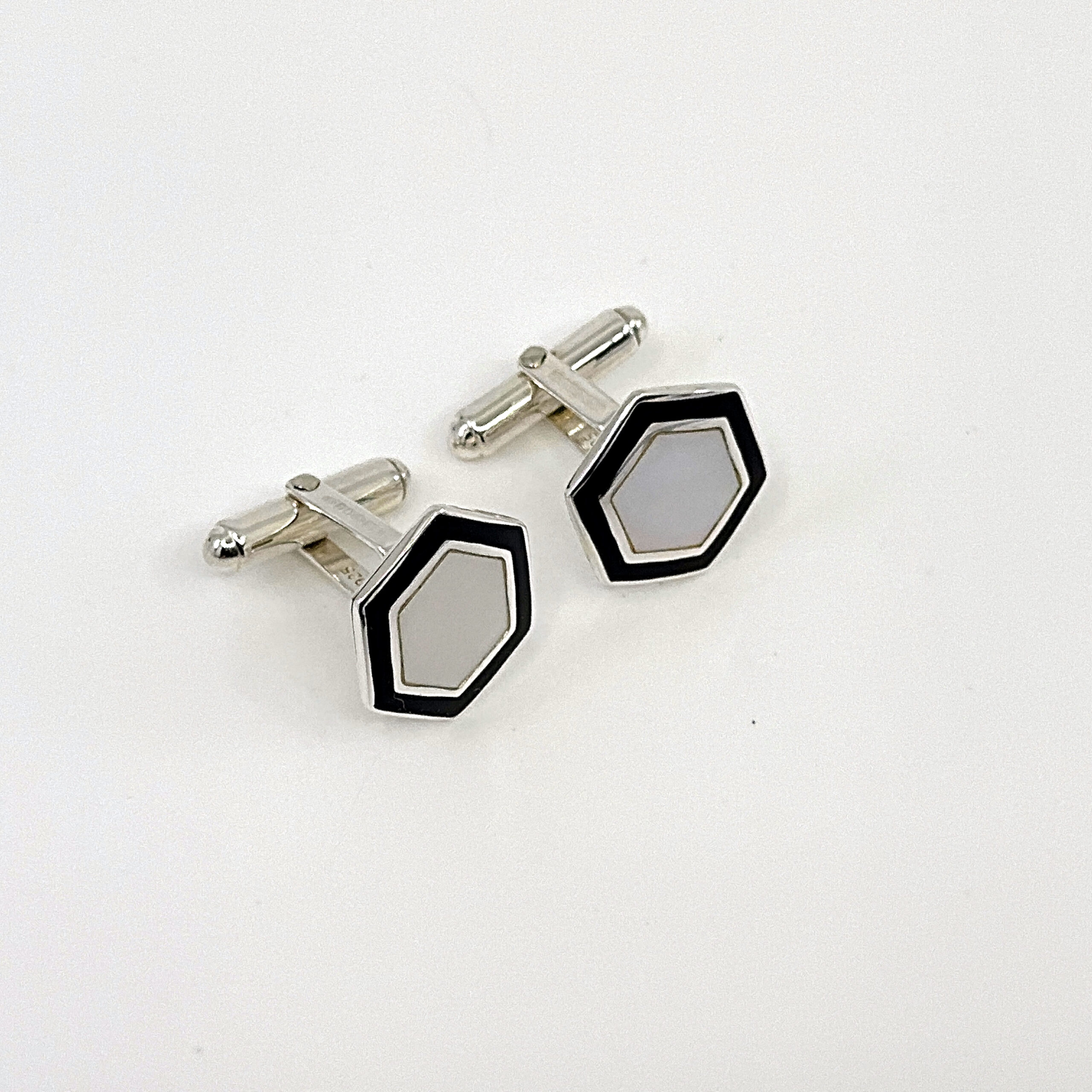 Defined by a geometric hexagonal form, these cufflinks combine structured design with contrasting materials. The surface features a combination of black enamel and mother of pearl, creating a balanced interplay between depth and natural lustre.