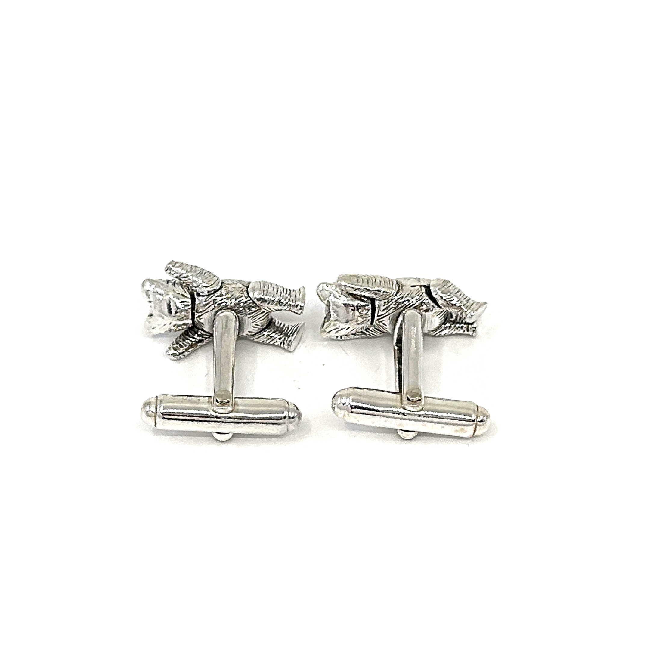 Crafted in England from 925 sterling silver and bearing English hallmarks, these cufflinks are meticulously finished to achieve clarity in the sculptural detailing. The articulated construction allows for movement in each limb, while the torpedo fitting ensures ease of wear and a secure closure.