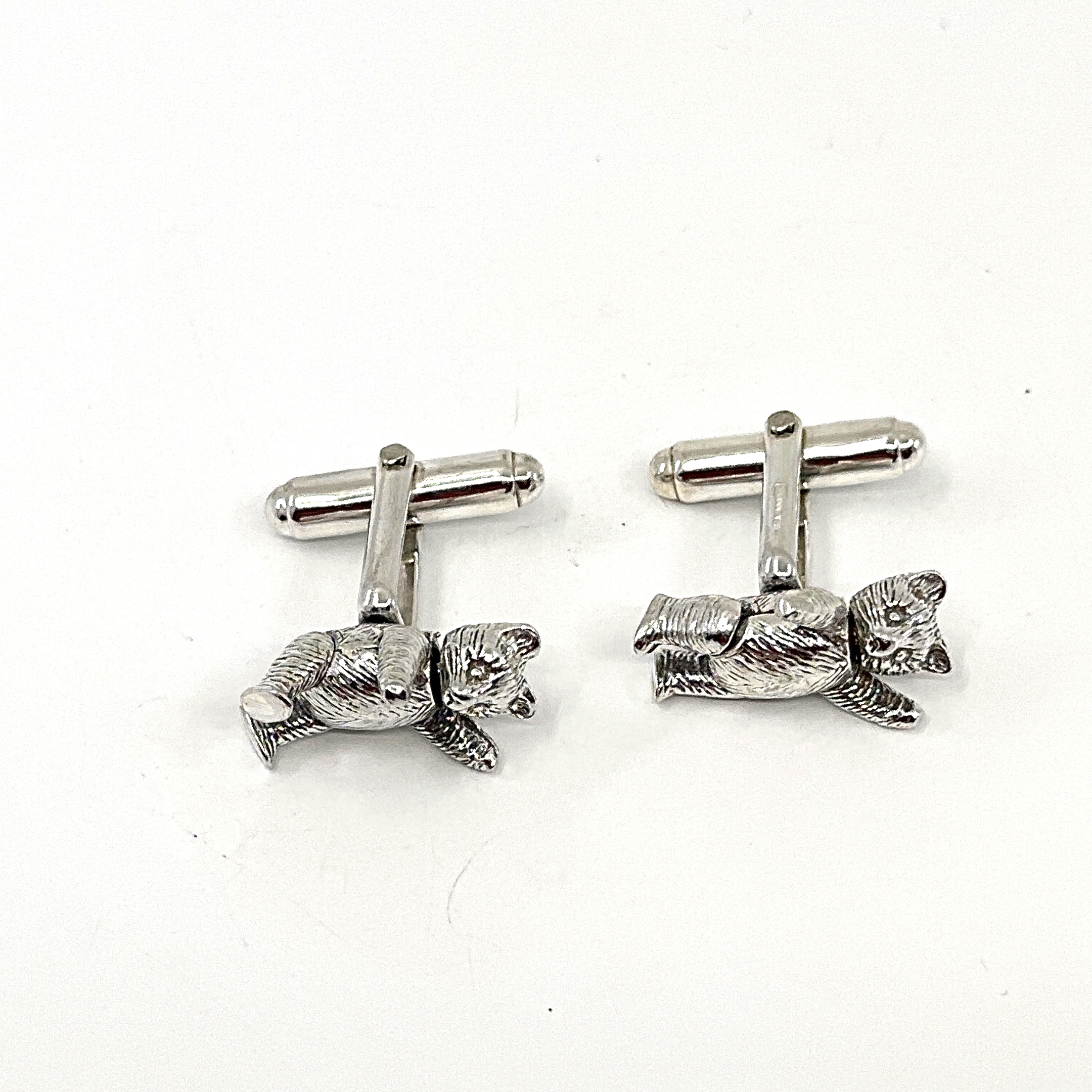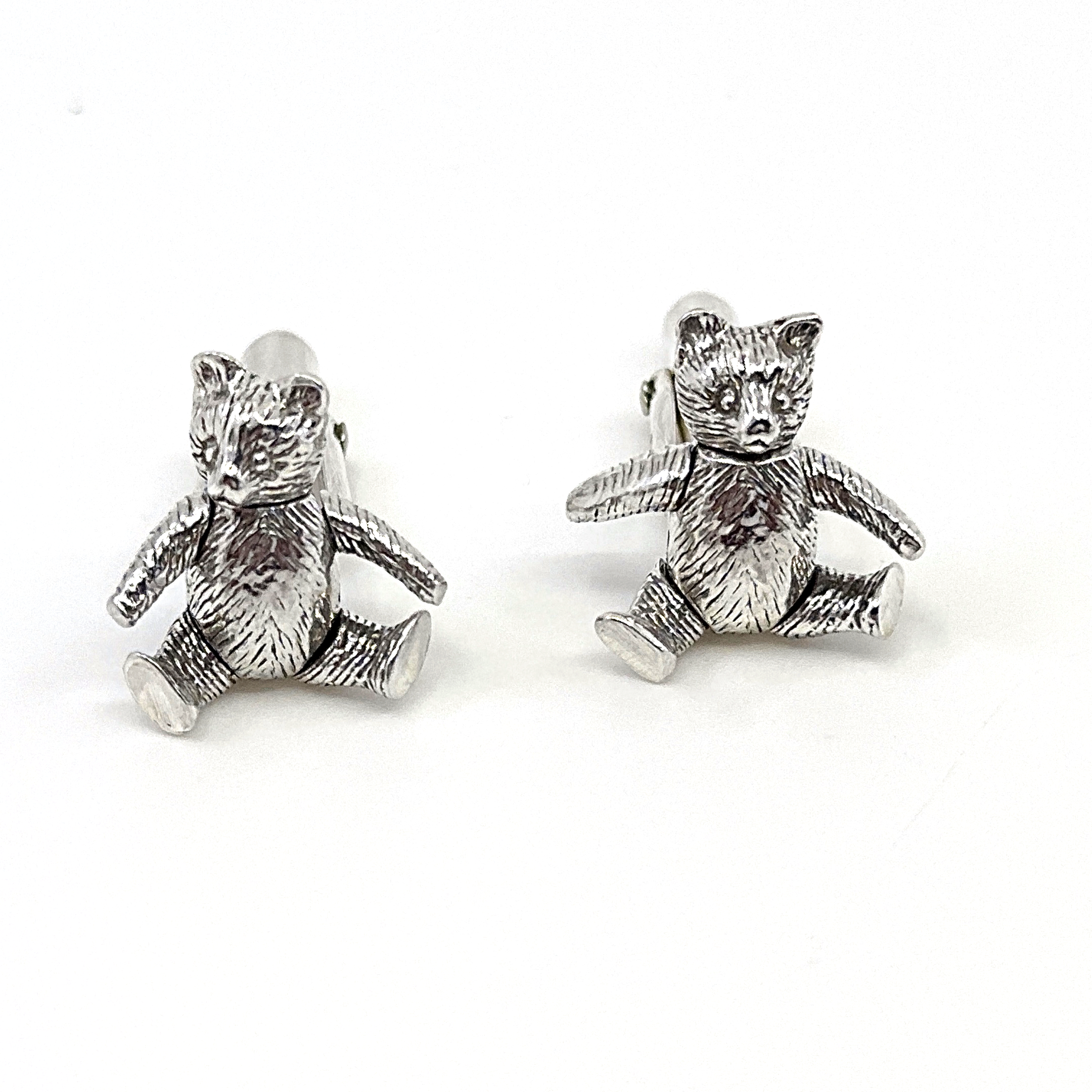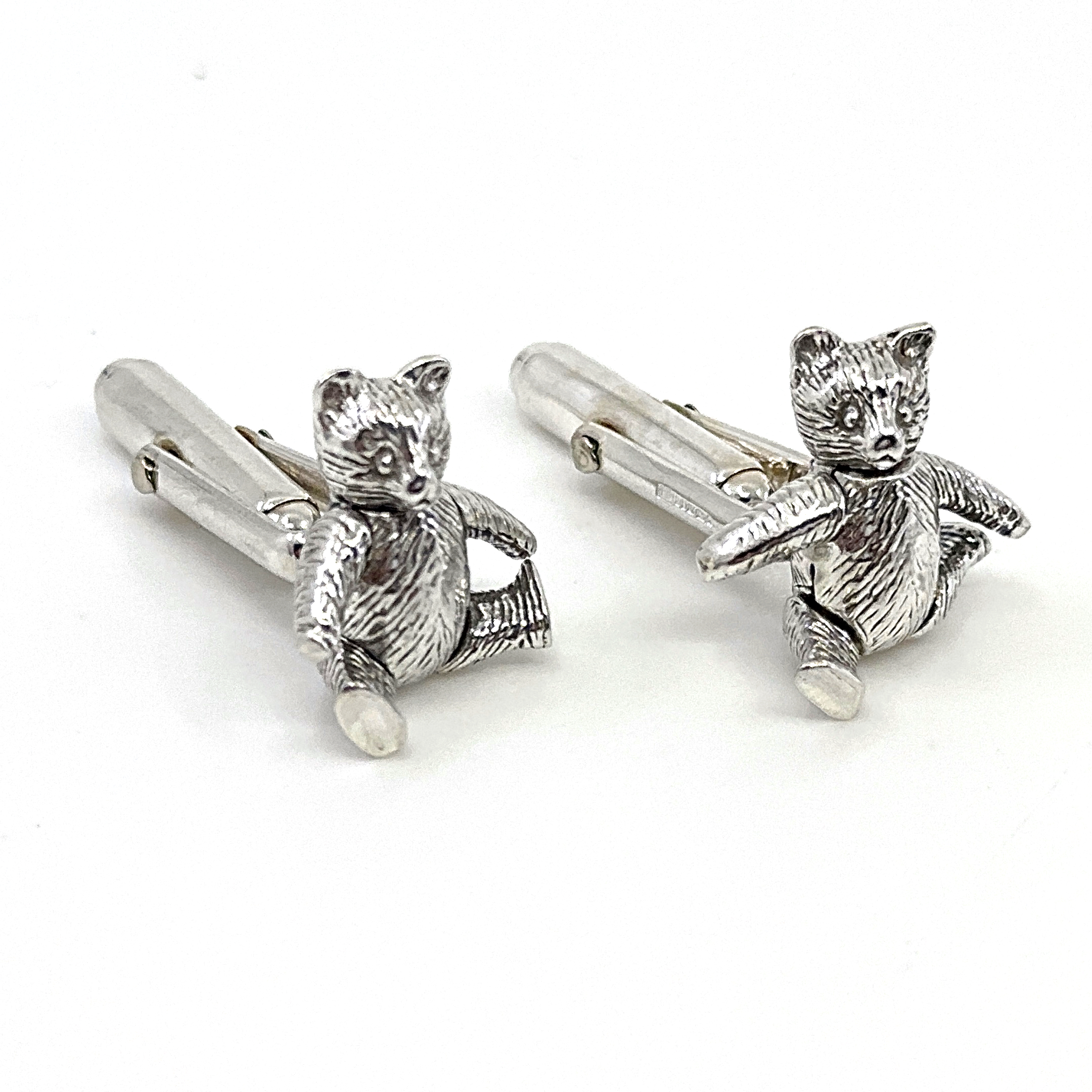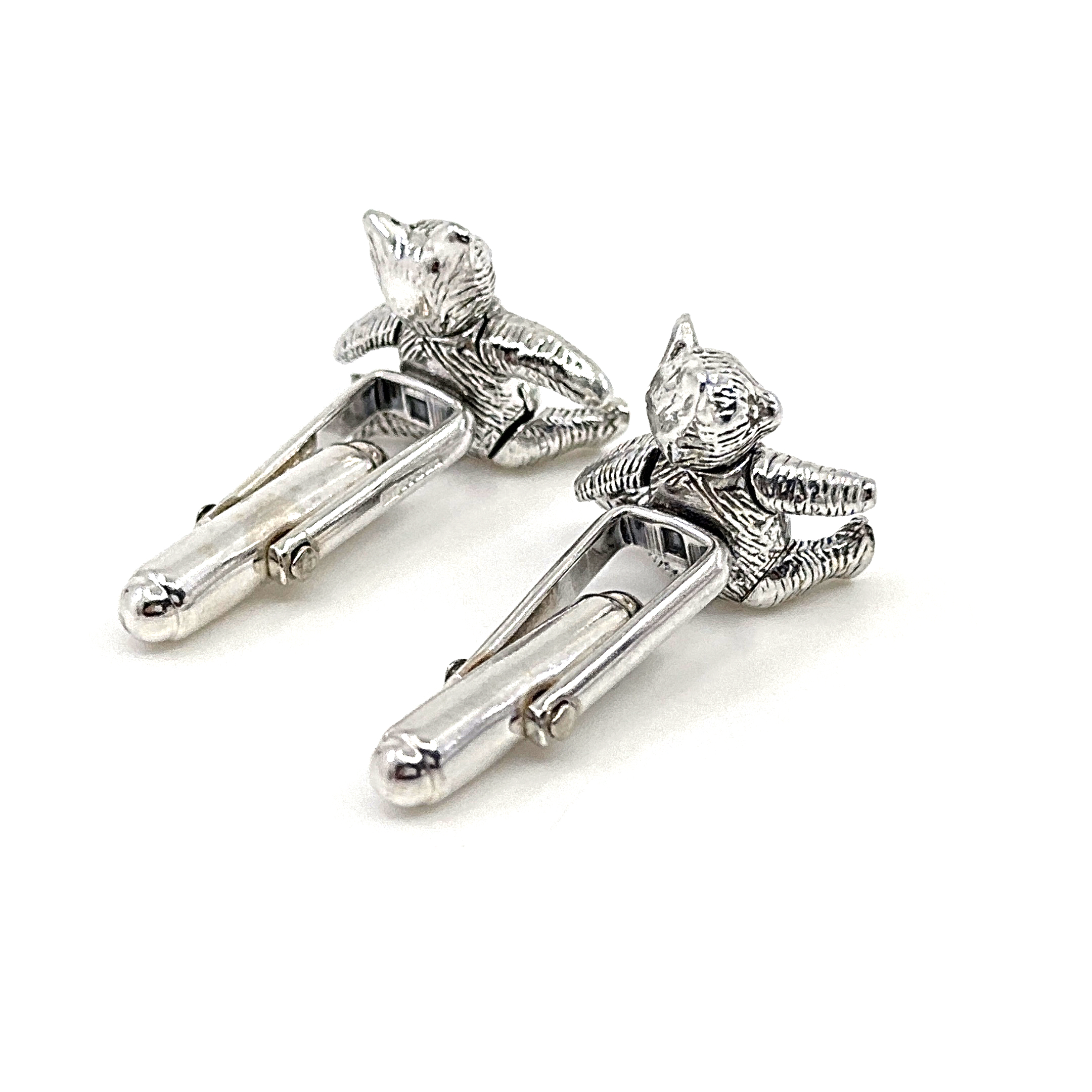 Featuring a detailed teddy bear motif with articulated limbs, these cufflinks present a playful yet finely crafted design. The movable arms and legs introduce an element of interaction, creating a piece that is both distinctive and engaging.