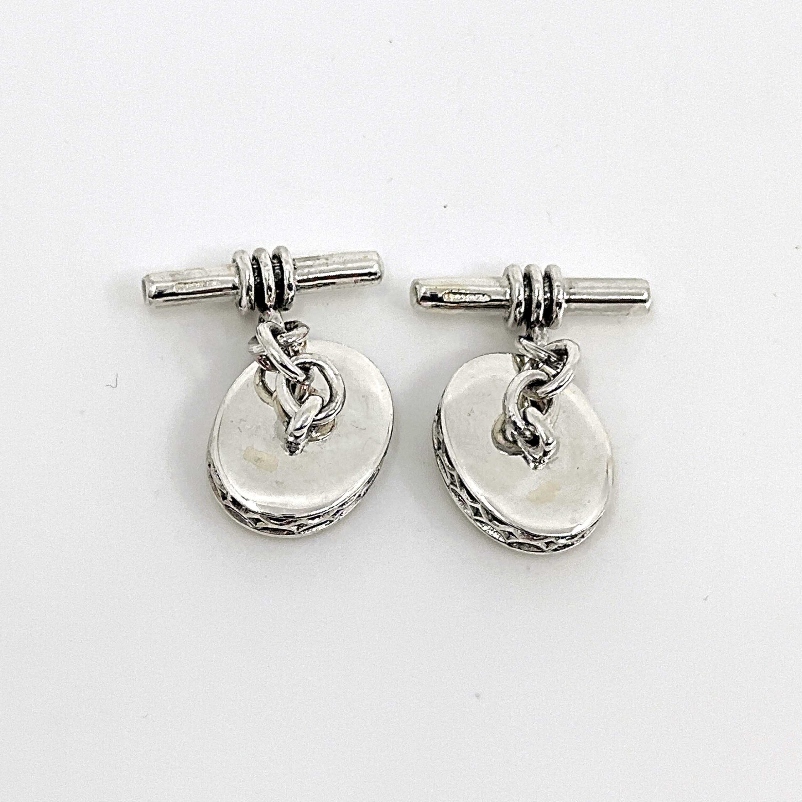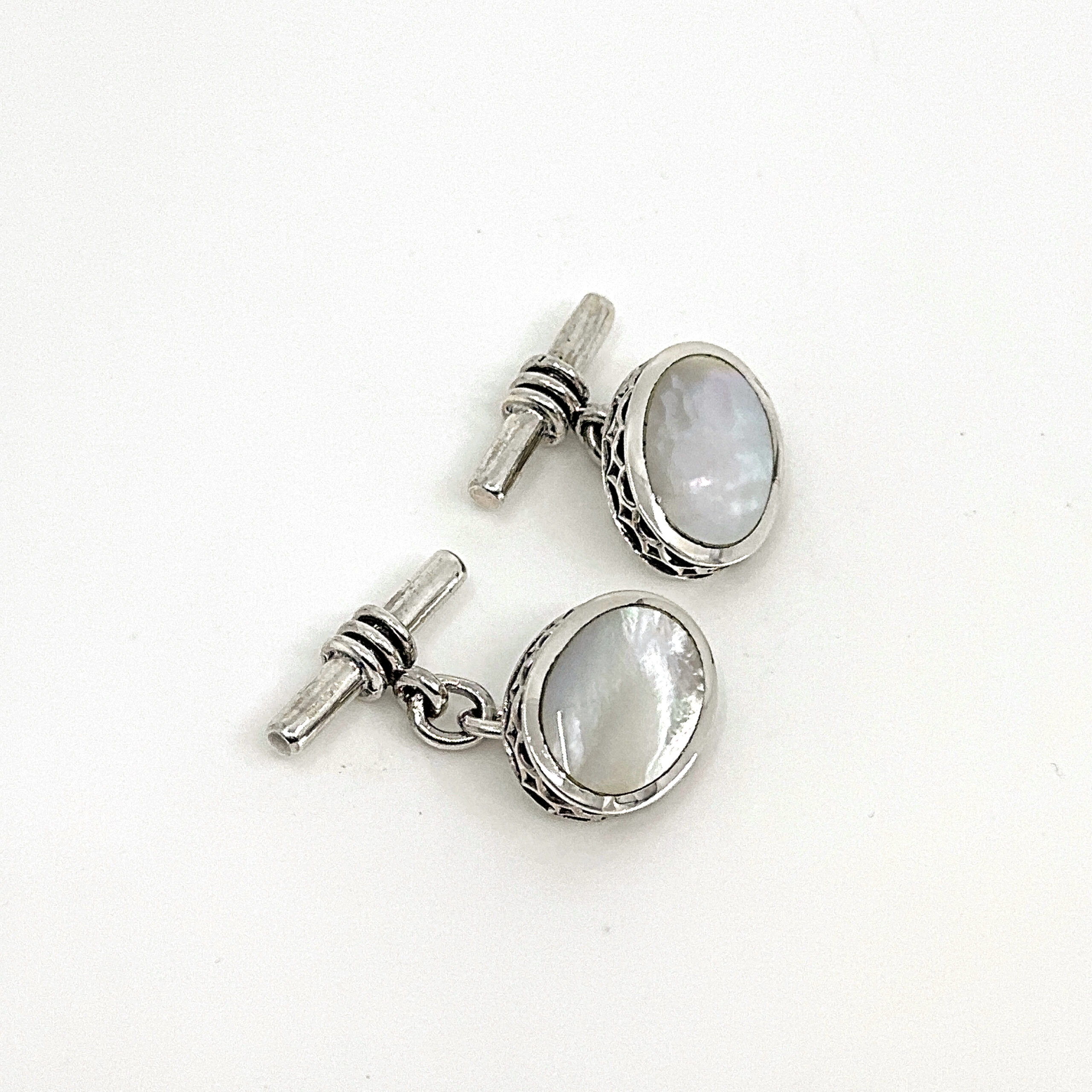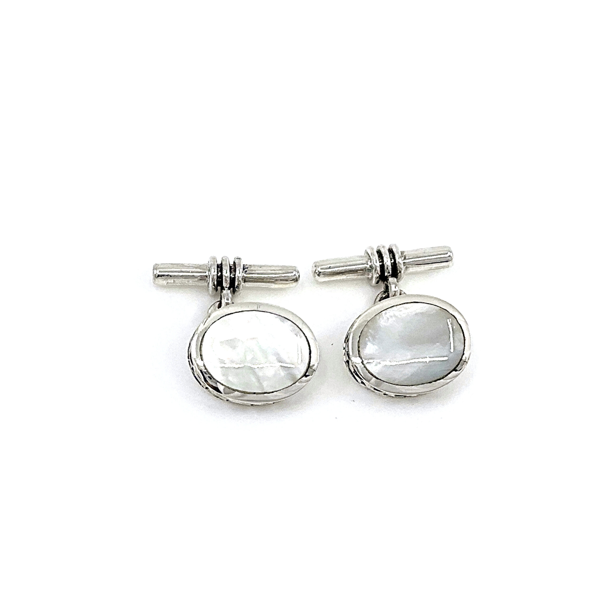 Featuring an oval form, these cufflinks present a refined and balanced design. The face is set with mother of pearl, offering a soft, natural lustre that contrasts with the polished silver setting.