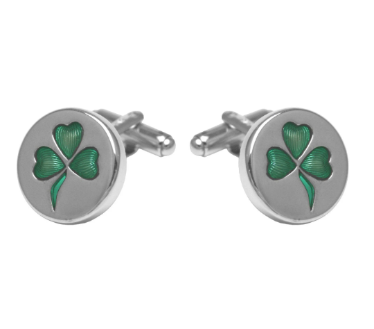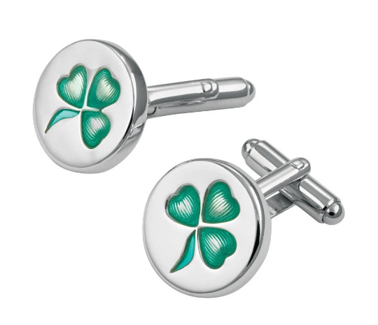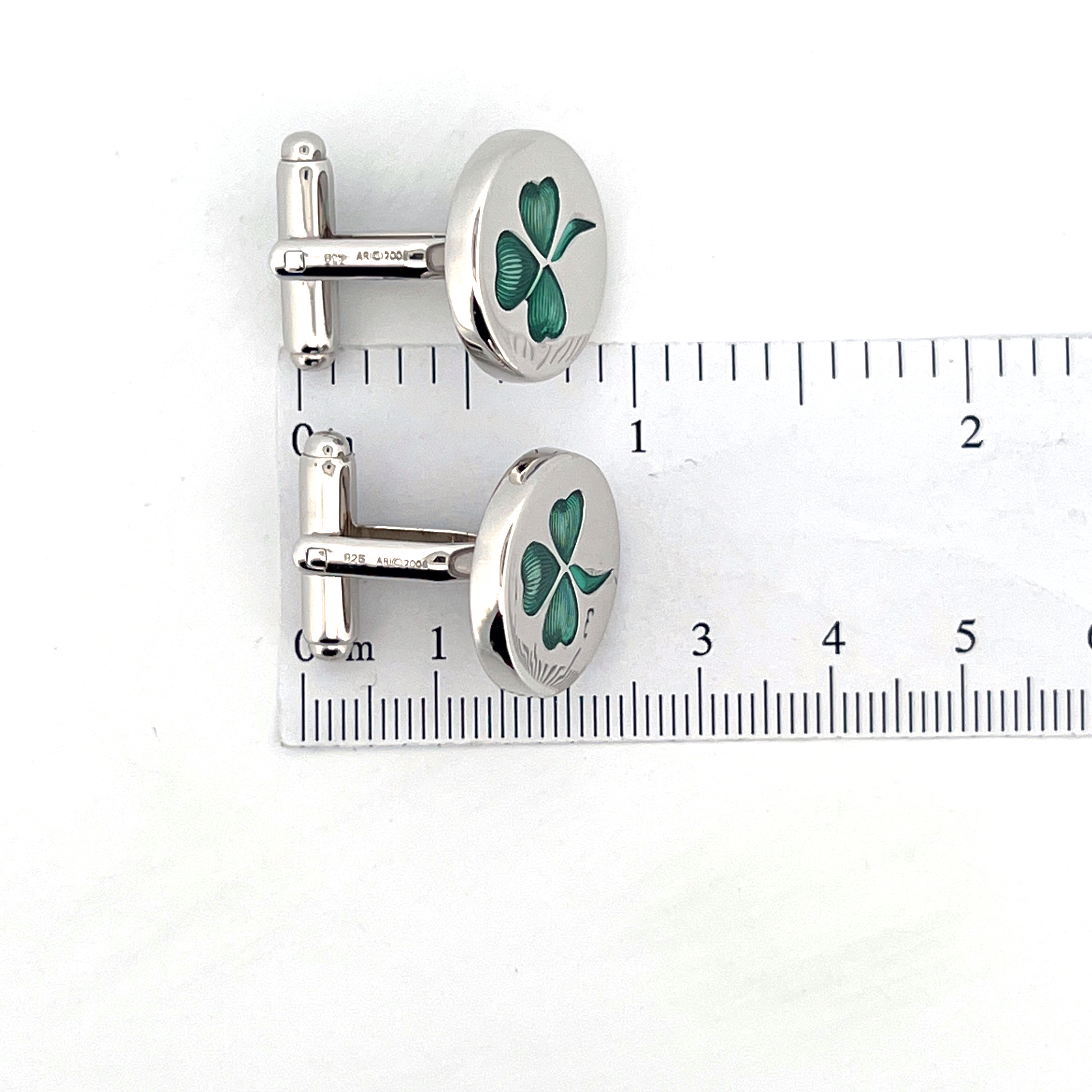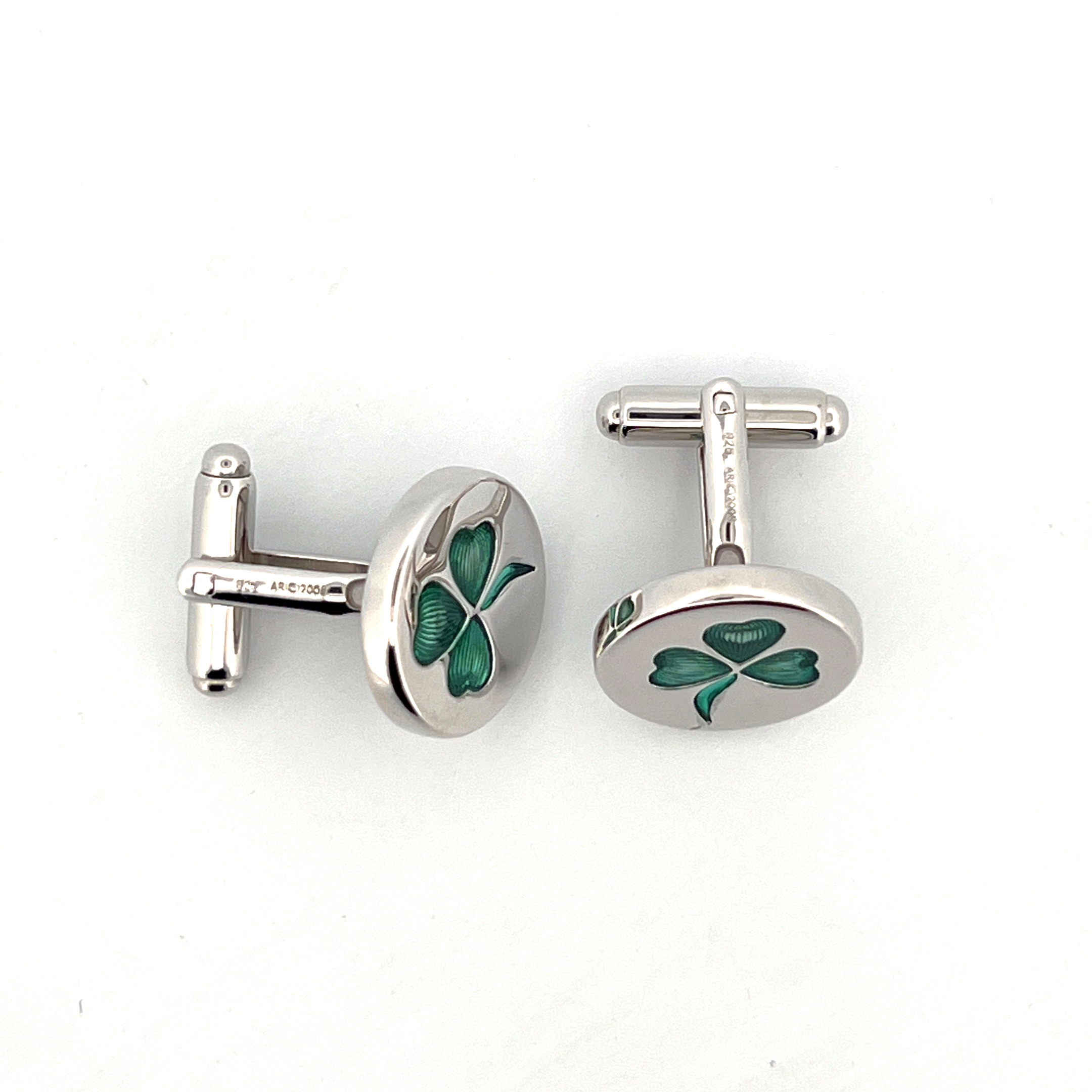 Crafted in England from 925 sterling silver and bearing English hallmarks, these cufflinks are carefully finished and set with green enamel to highlight the clover design. The torpedo fitting ensures ease of wear and a secure closure.