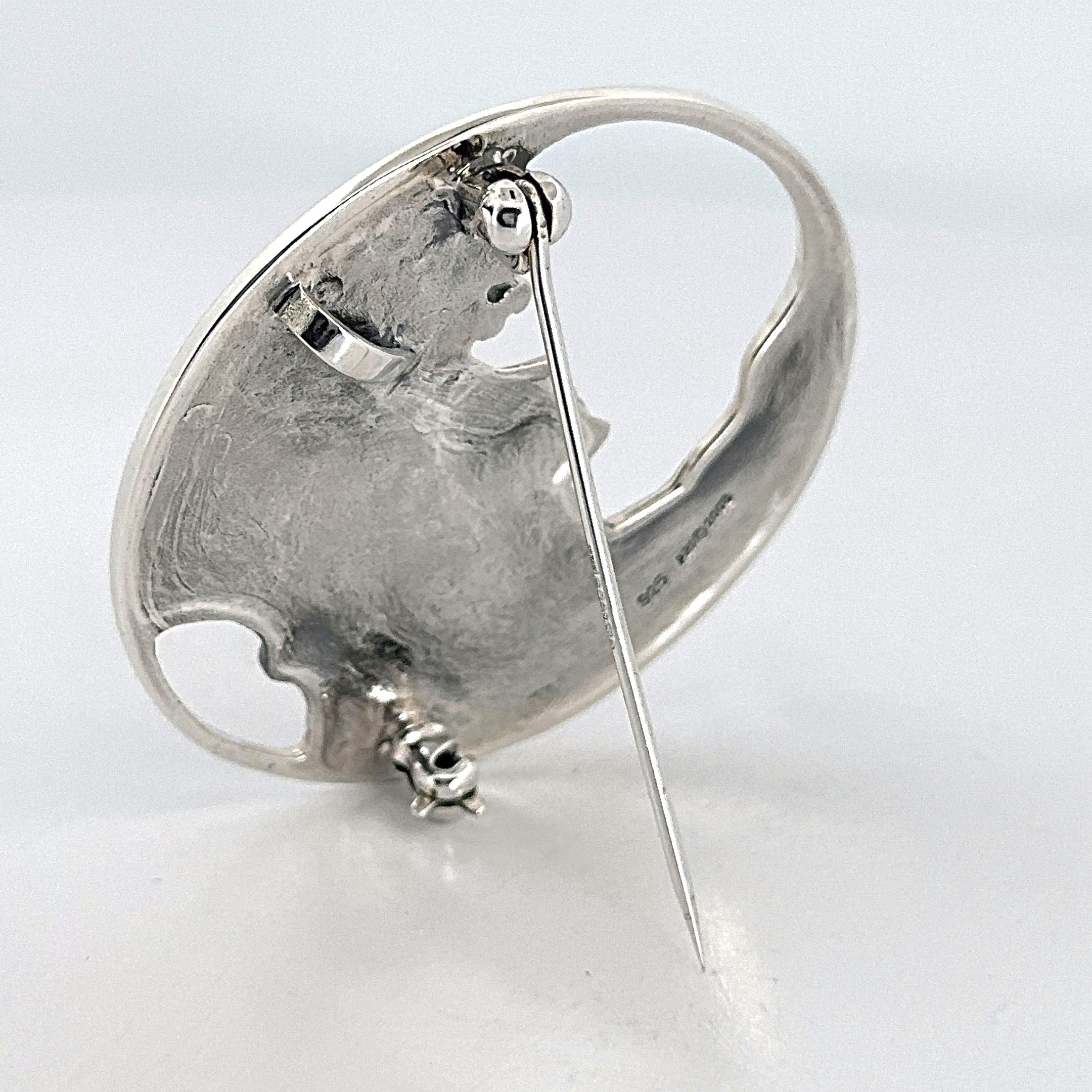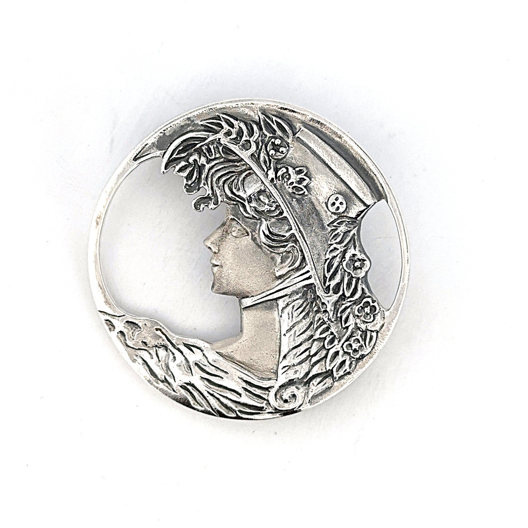 This brooch depicts a stylised lady’s head wearing a sun hat, inspired by the flowing lines and decorative character of the Art Nouveau period. The composition focuses on soft contours and balanced proportions, presenting the figure in a refined and controlled manner.