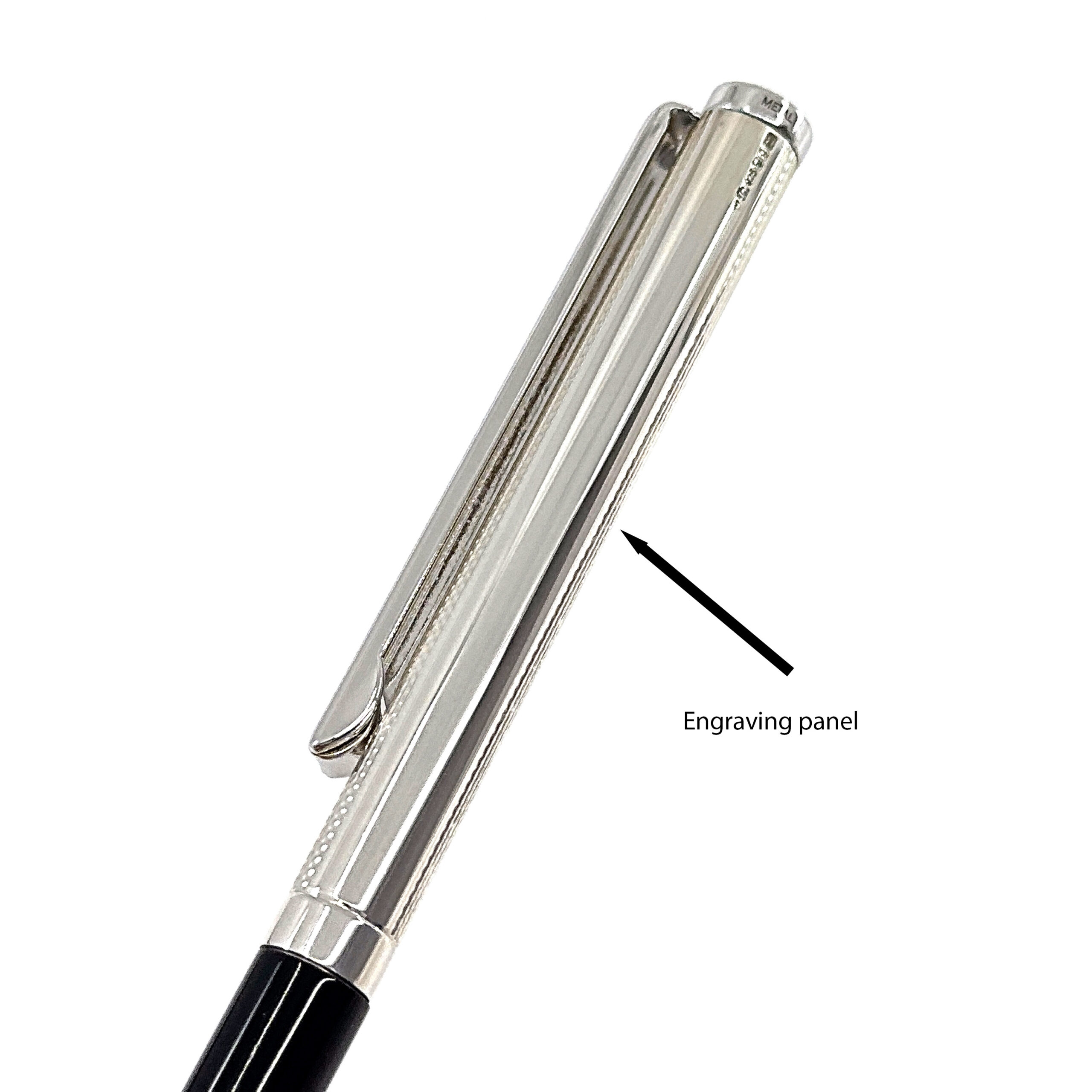 The design combines a sterling silver casing with a black acrylic barrel, creating a subtle contrast in tone and texture. An engine turned finish adds depth to the surface, while a plain panel provides space for engraving without interrupting the overall composition.