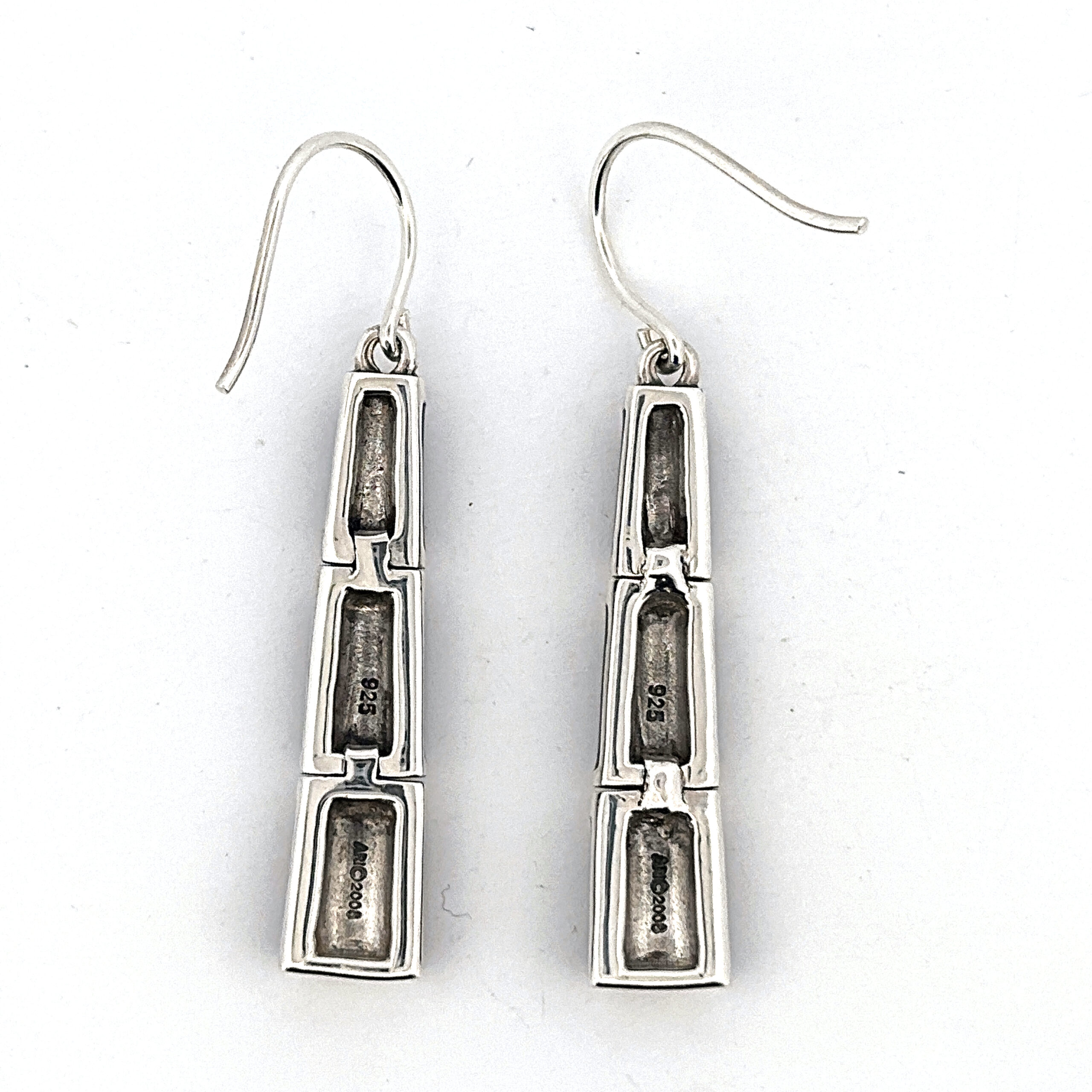 These drop earrings are designed in a bamboo style, featuring a slender and elongated form that reflects the segmented structure of the natural material. The linear composition creates a balanced and graceful silhouette.