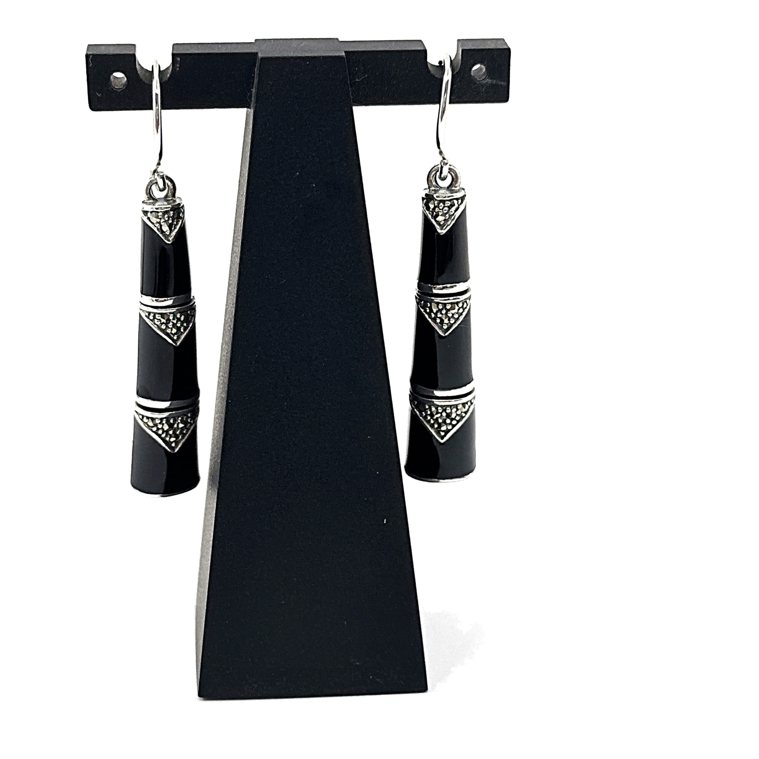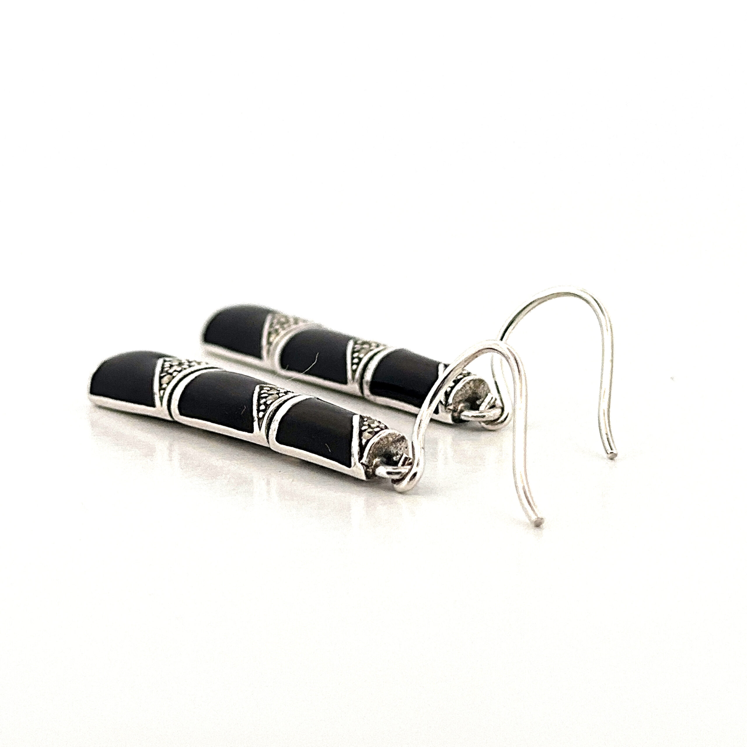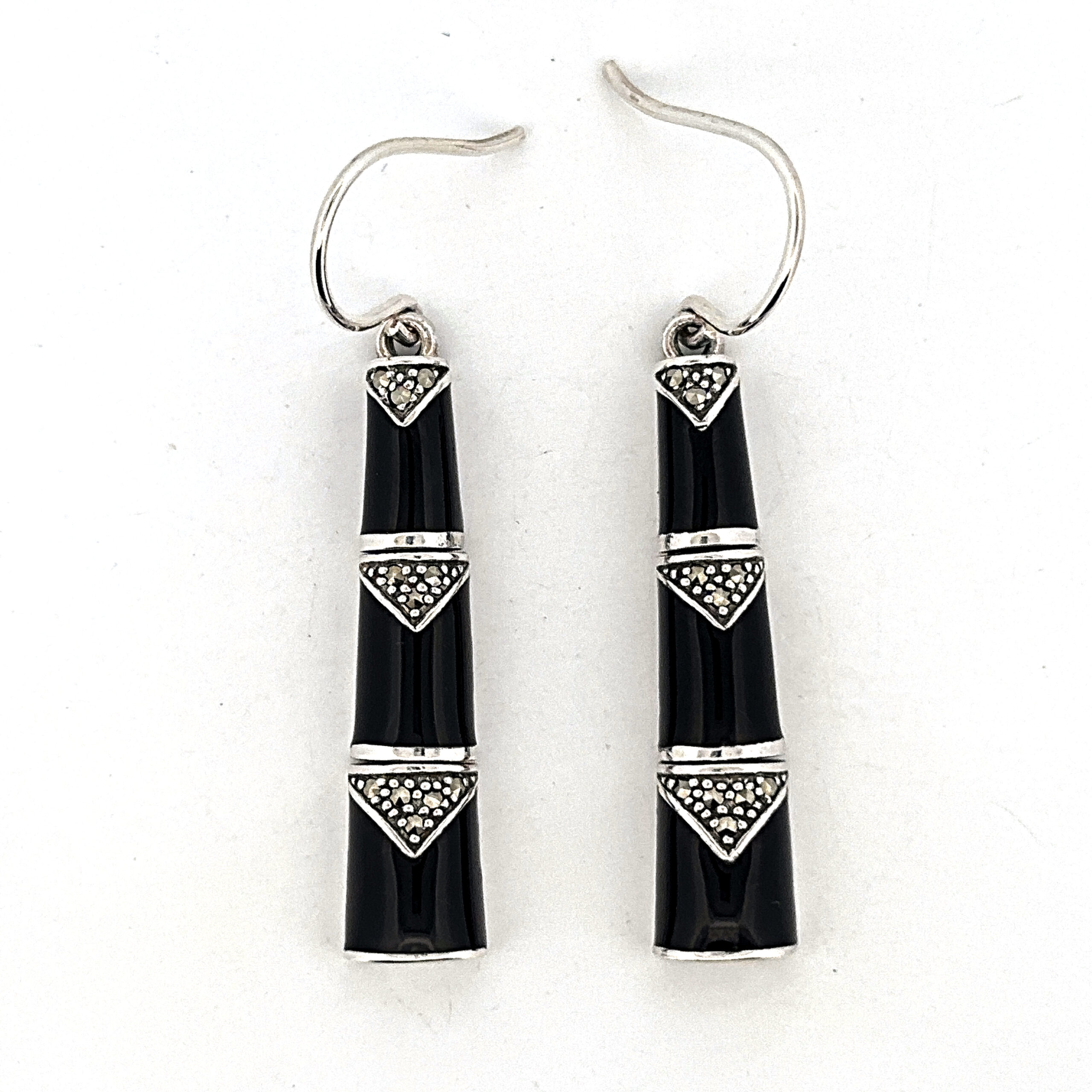 Black enamel introduces a strong contrast along the segmented sections, while marcasite detailing adds texture and definition. Suspended from French hook fittings, the design allows for ease of wear and natural movement.