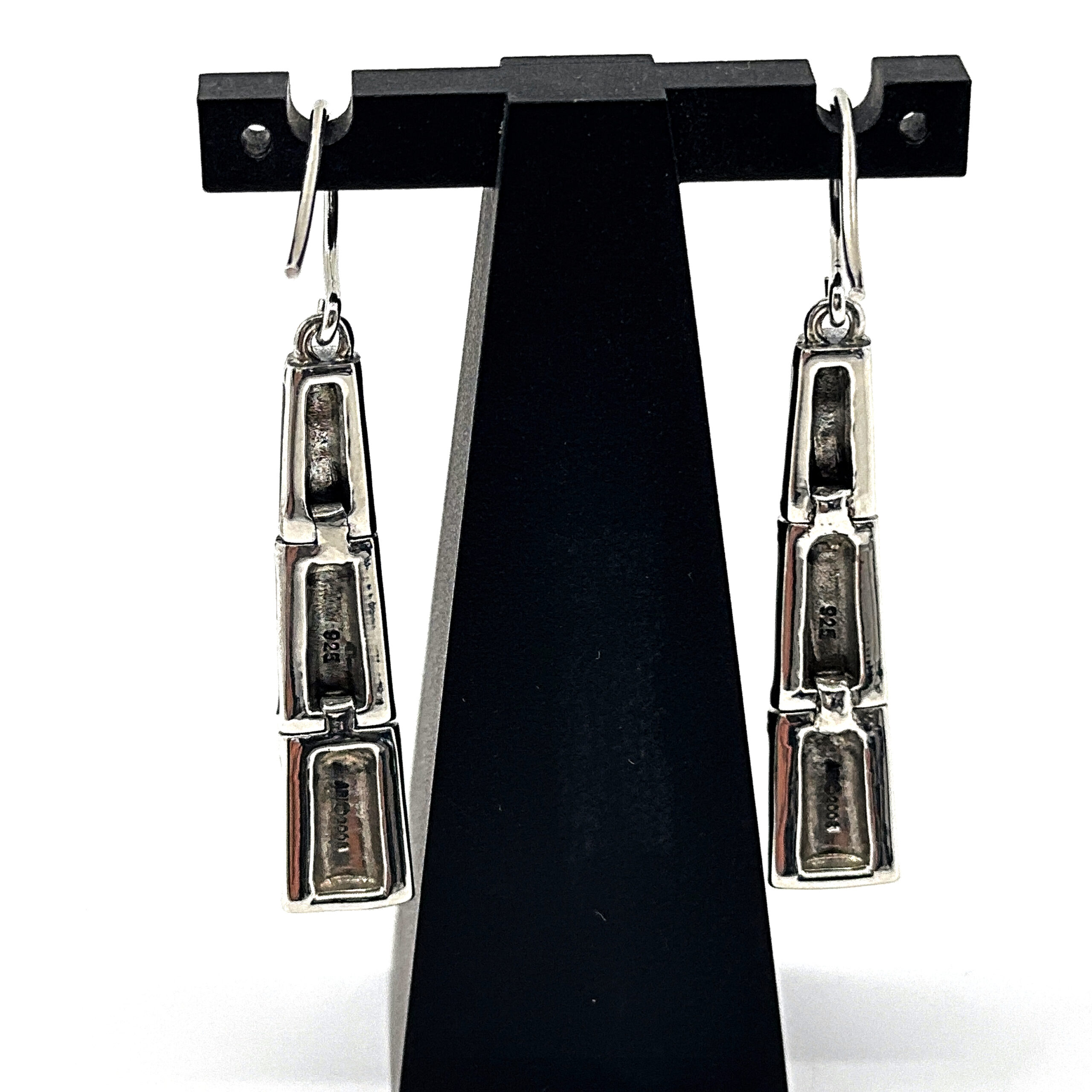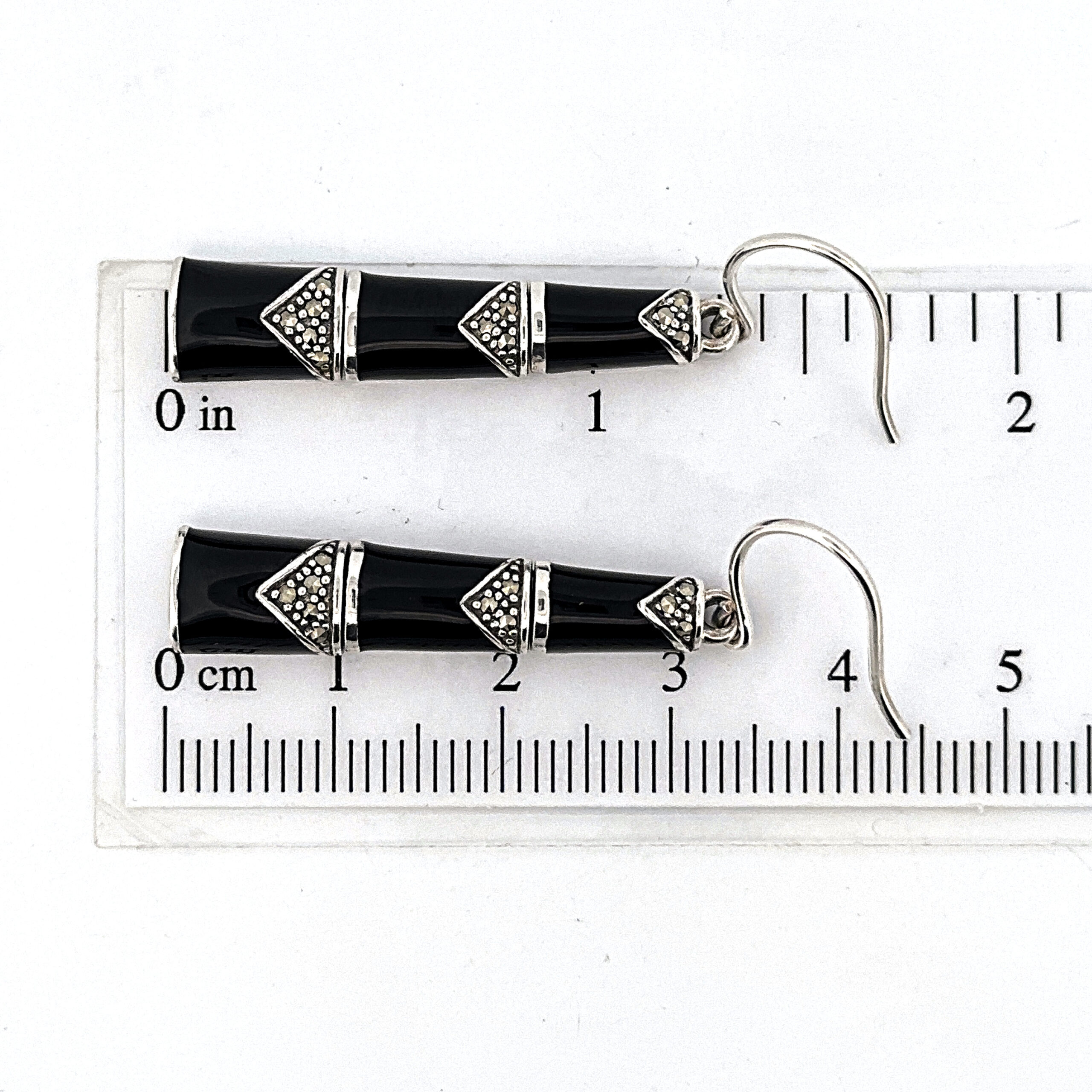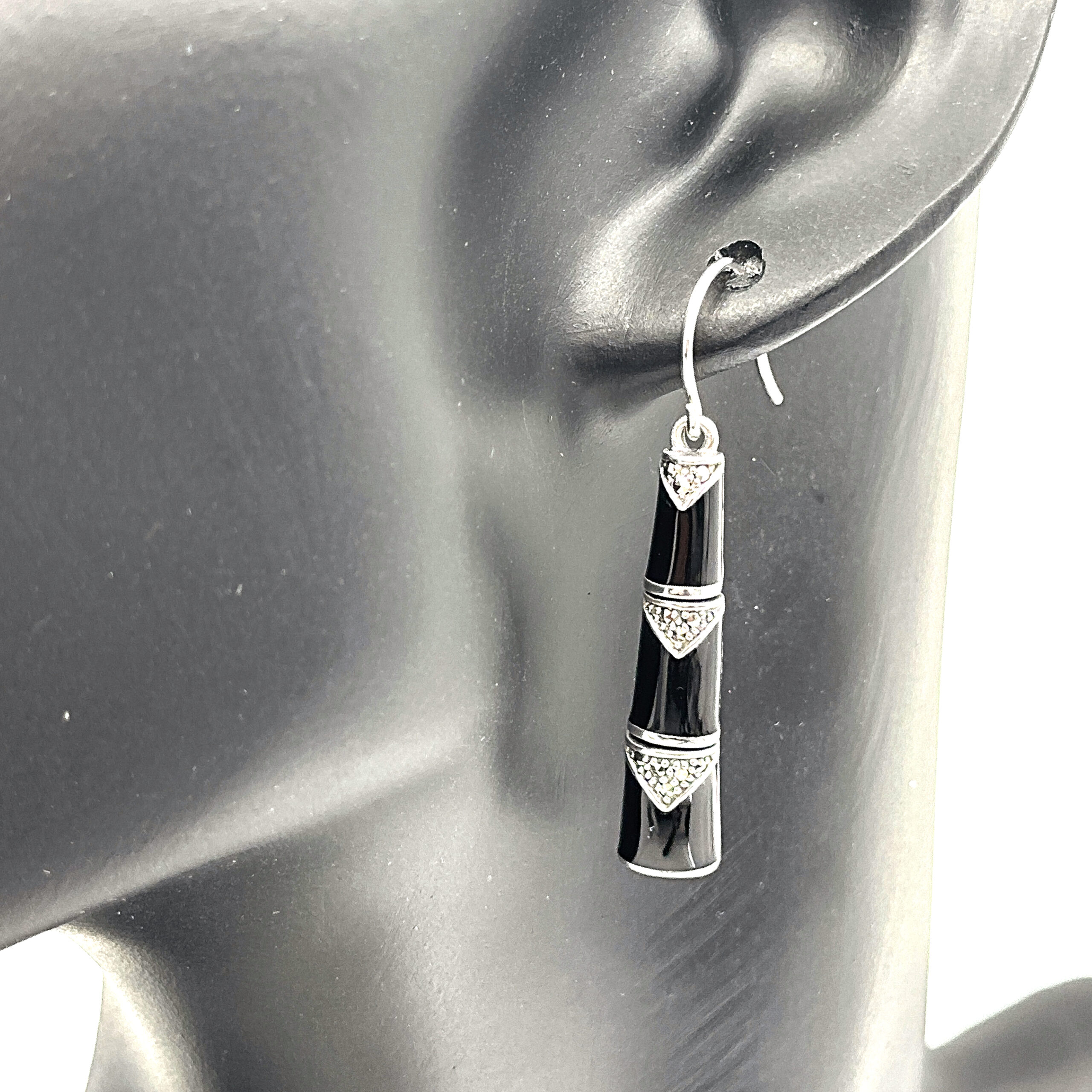 Black enamel introduces a strong contrast along the segmented sections, while marcasite detailing adds texture and definition. Suspended from French hook fittings, the design allows for ease of wear and natural movement.
