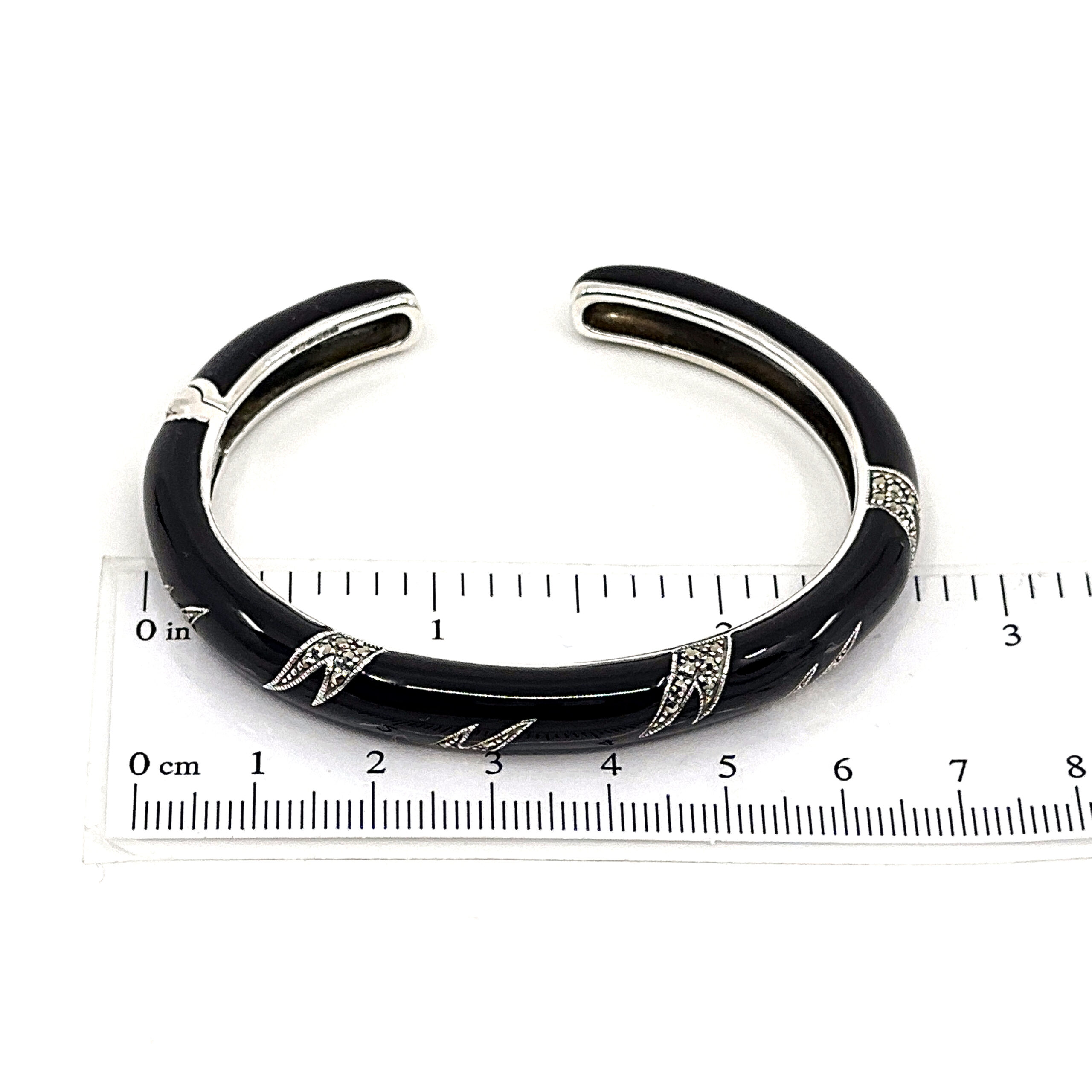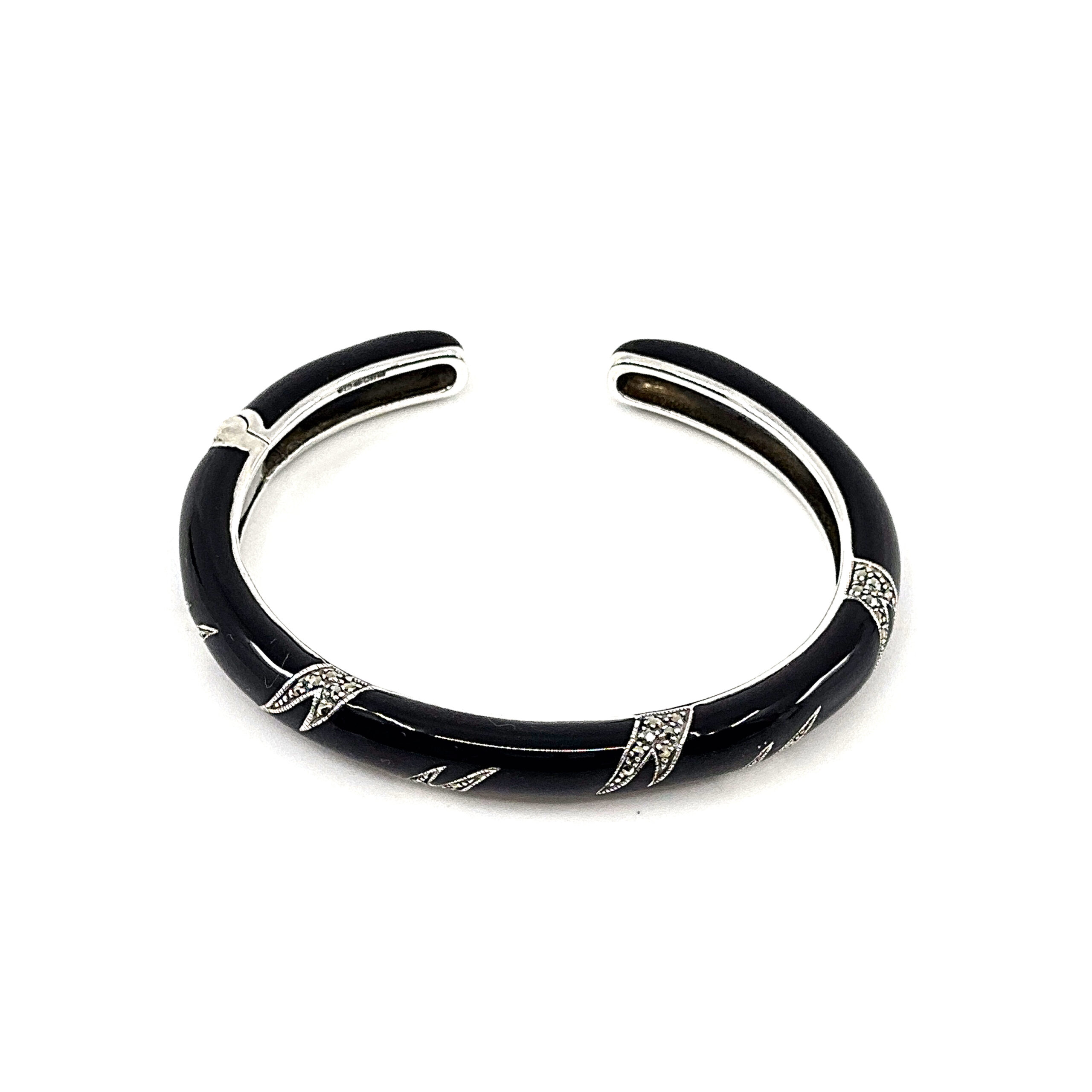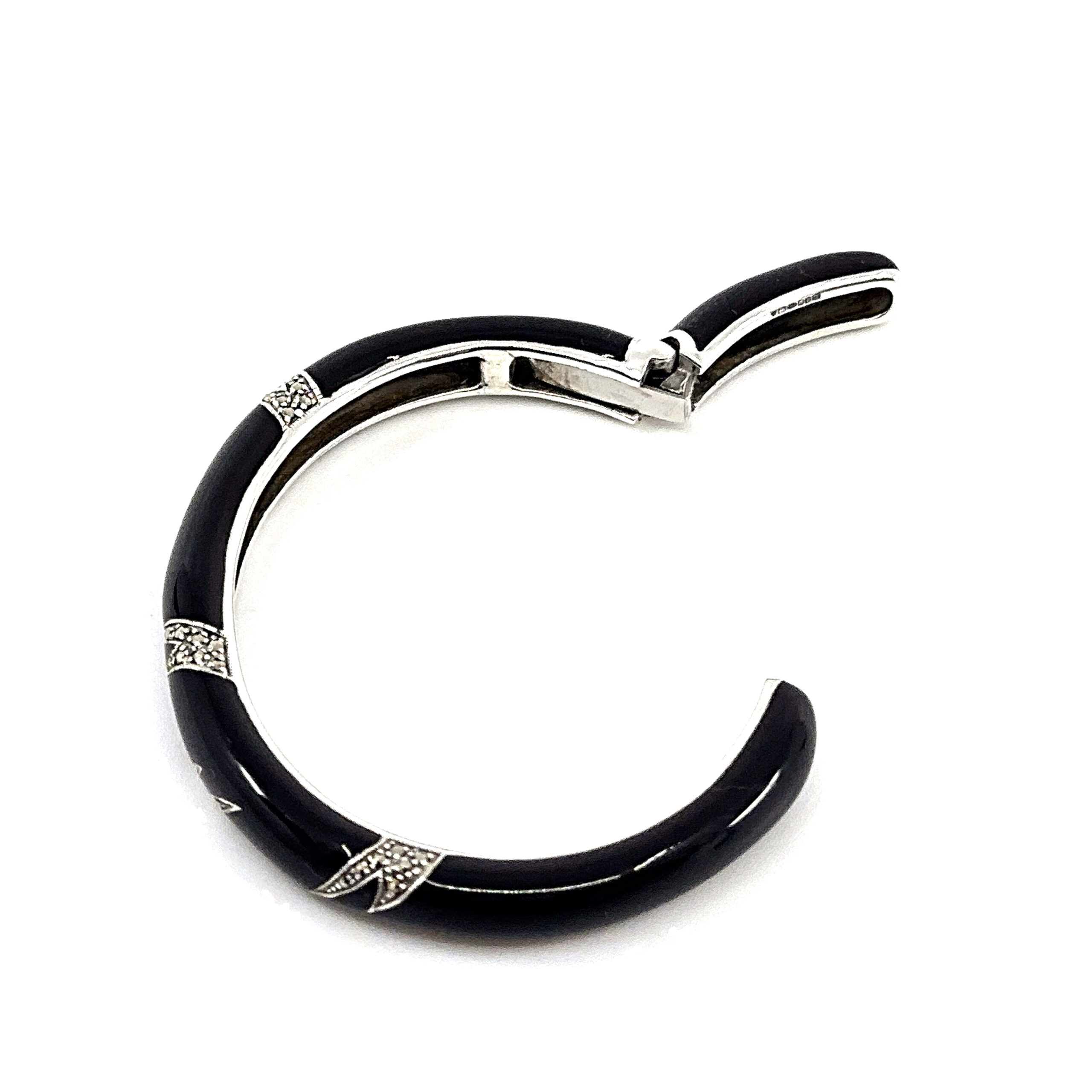 This cuff bangle is designed with a structured circular form, enriched with black enamel and marcasite to create a strong contrast across the surface. The composition balances smooth enamel sections with detailed stone accents, resulting in a refined and clearly defined decorative piece.