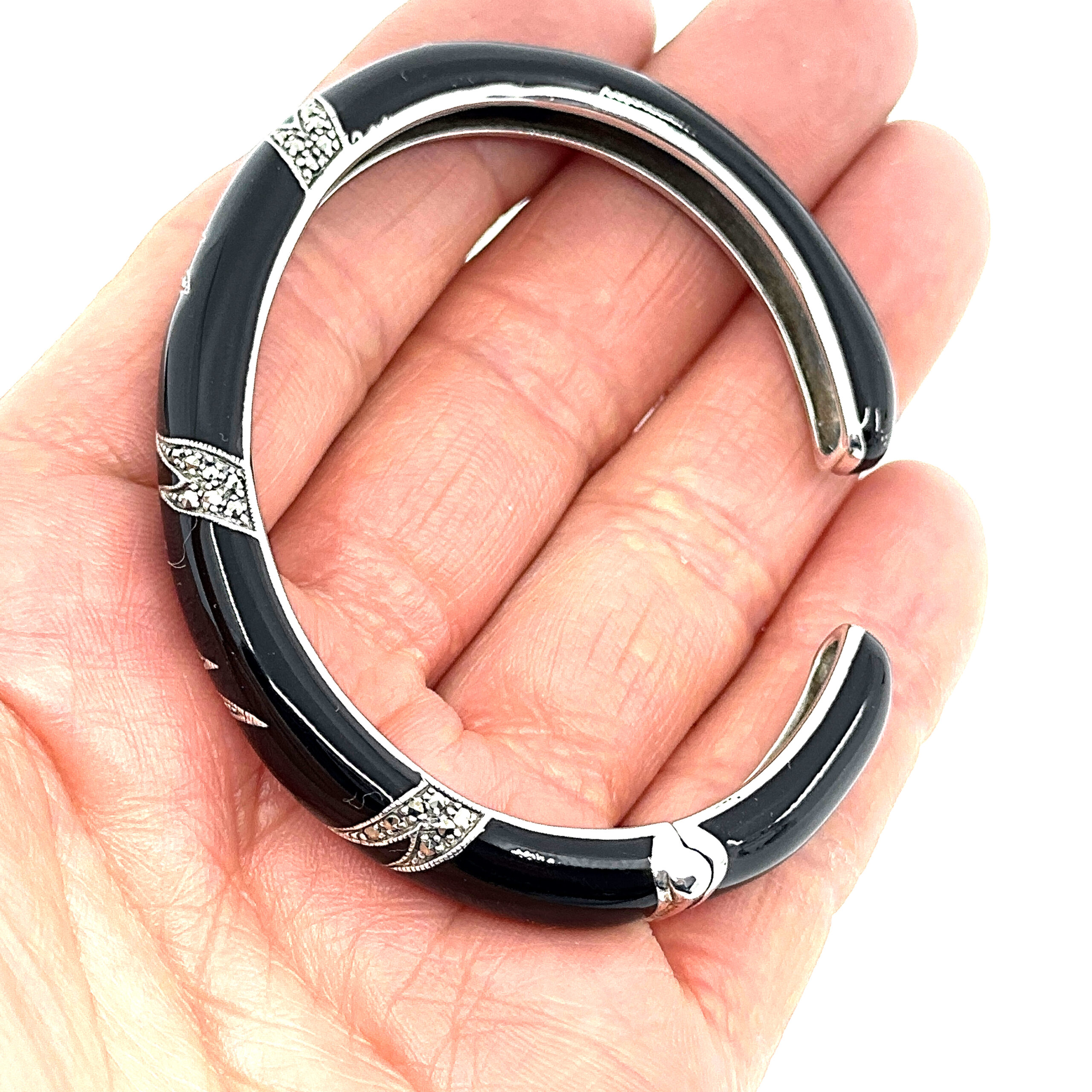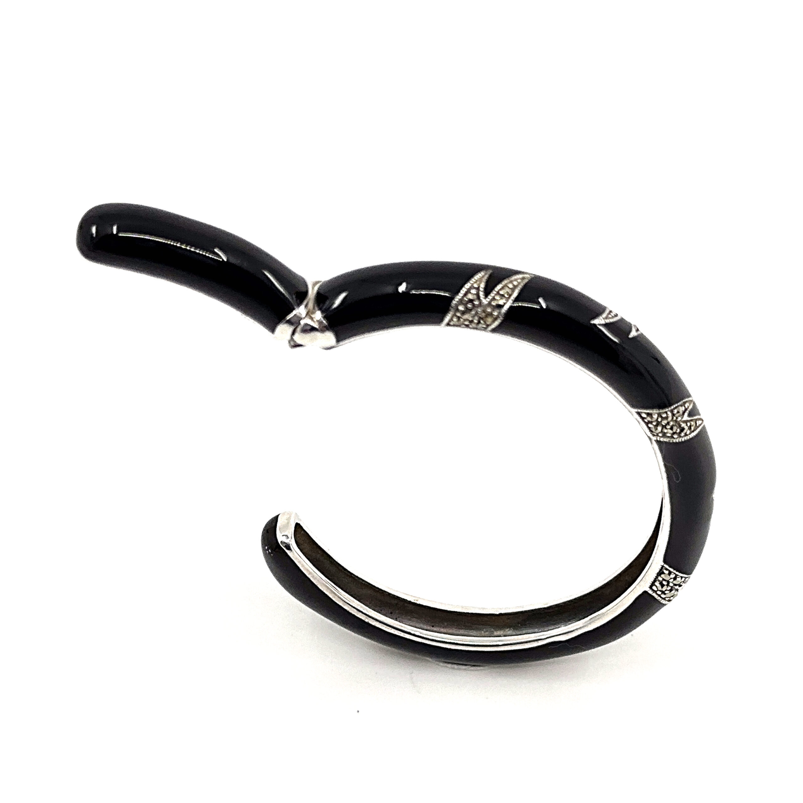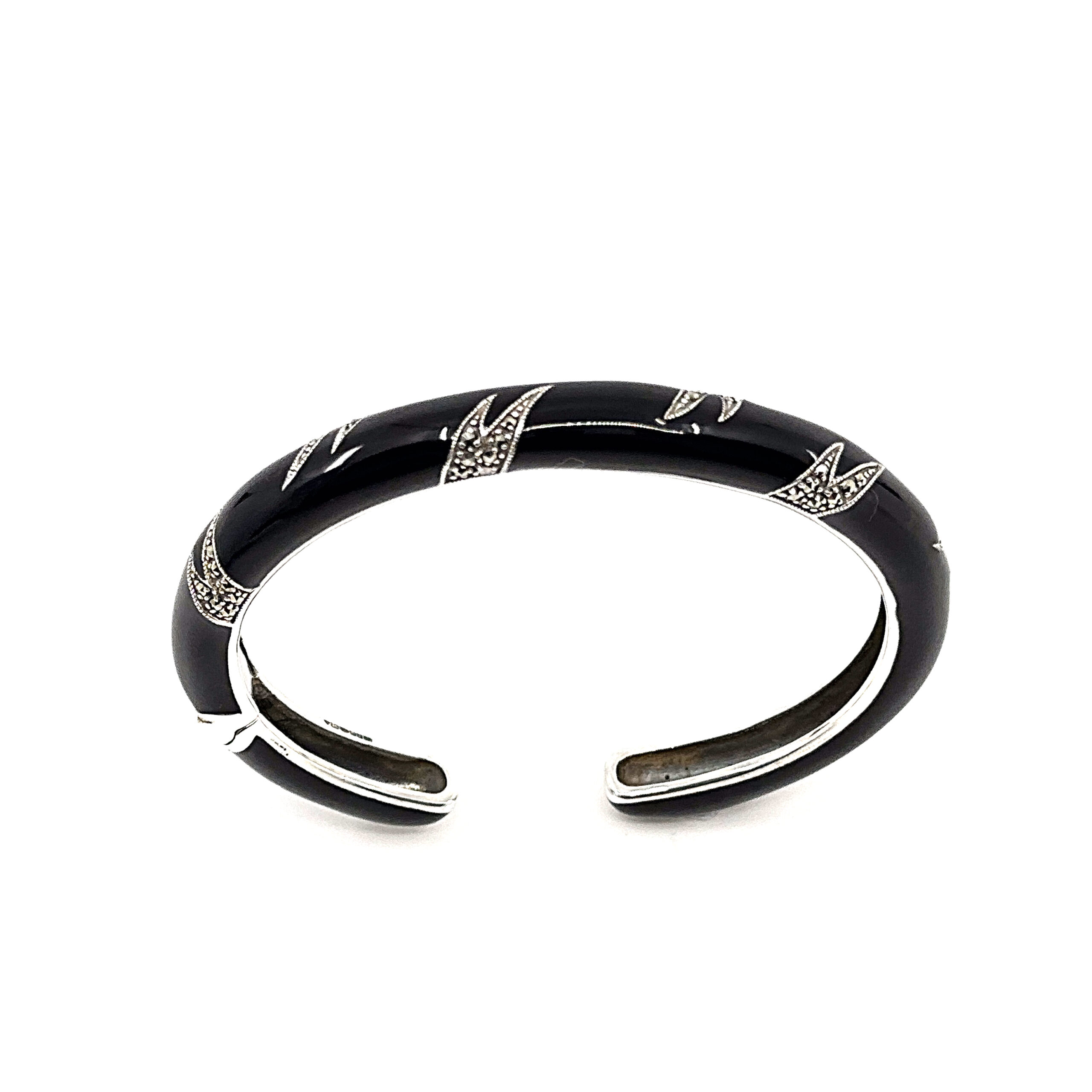 This cuff bangle is designed with a structured circular form, enriched with black enamel and marcasite to create a strong contrast across the surface. The composition balances smooth enamel sections with detailed stone accents, resulting in a refined and clearly defined decorative piece.