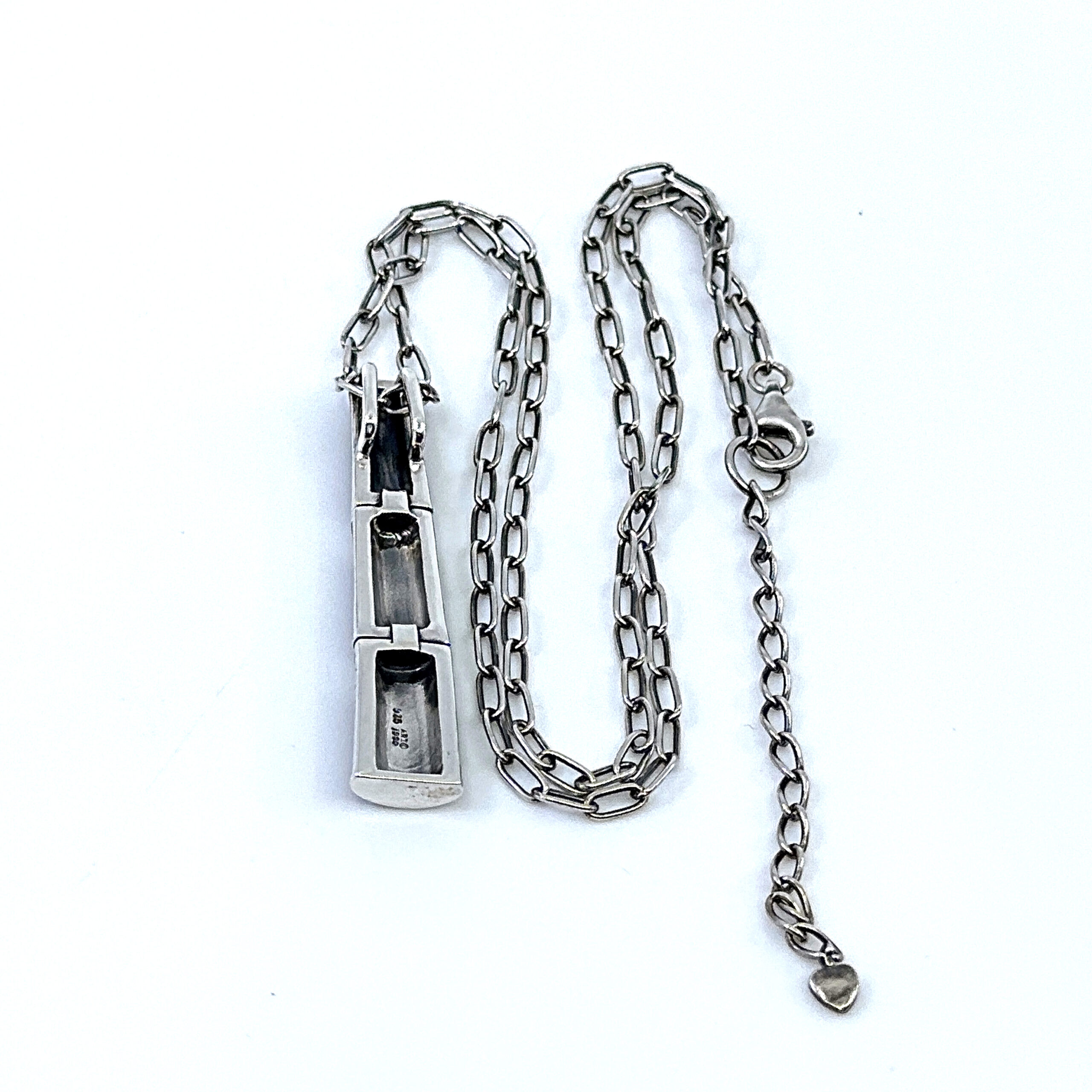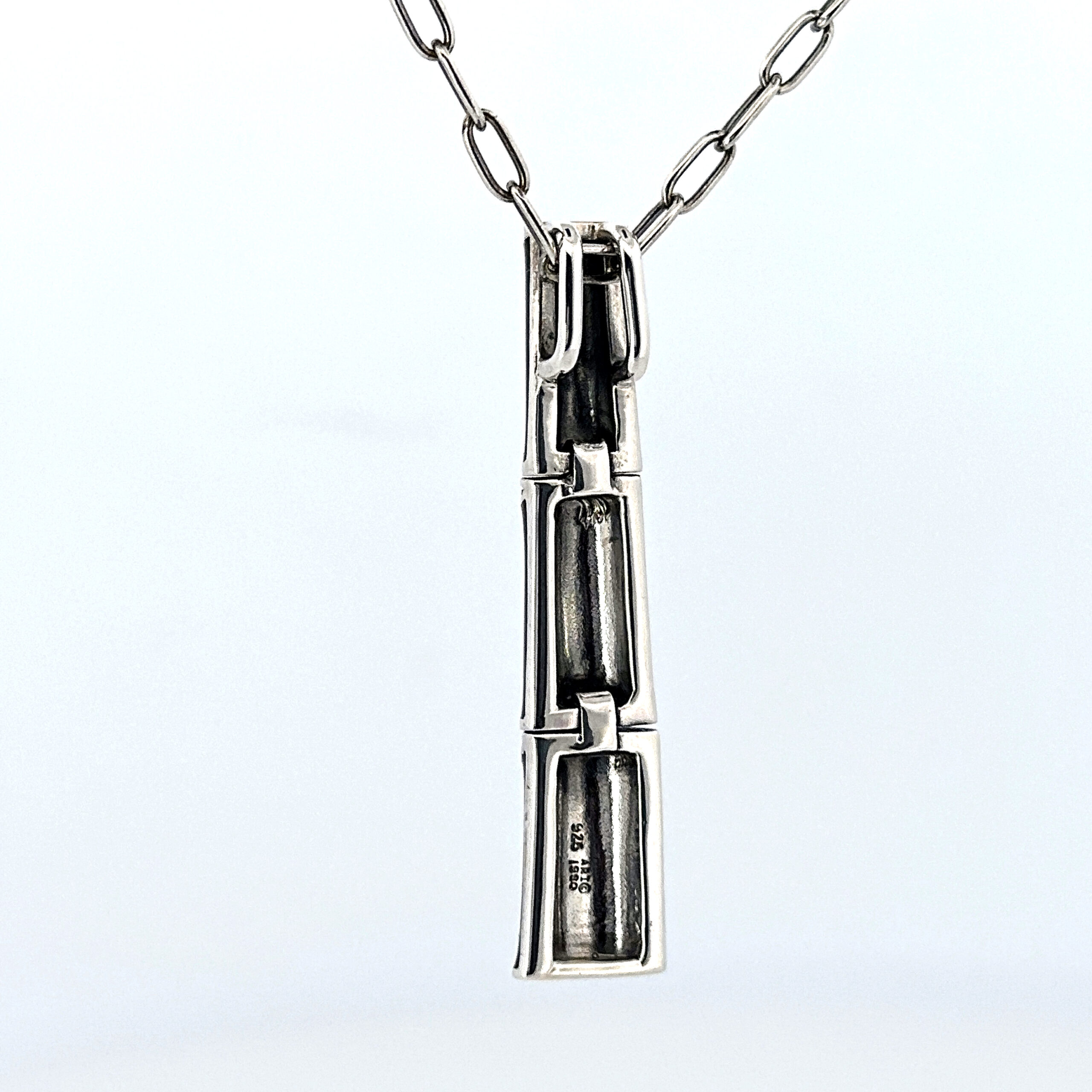 This pendant necklace is designed around a bamboo-inspired form, using elongated segments to create a vertical drop that sits cleanly at the neckline. The structure gives the piece a defined presence while remaining balanced and wearable.