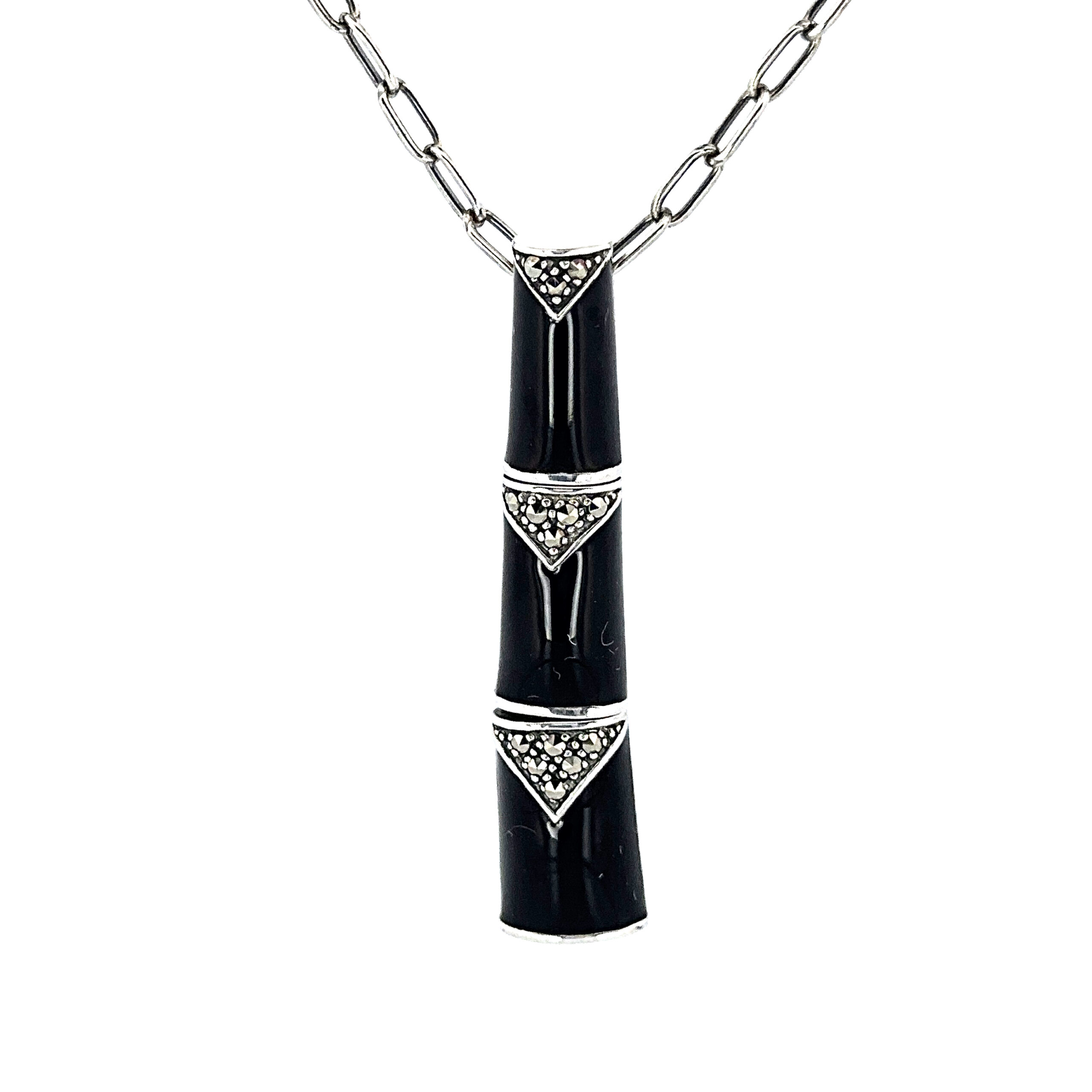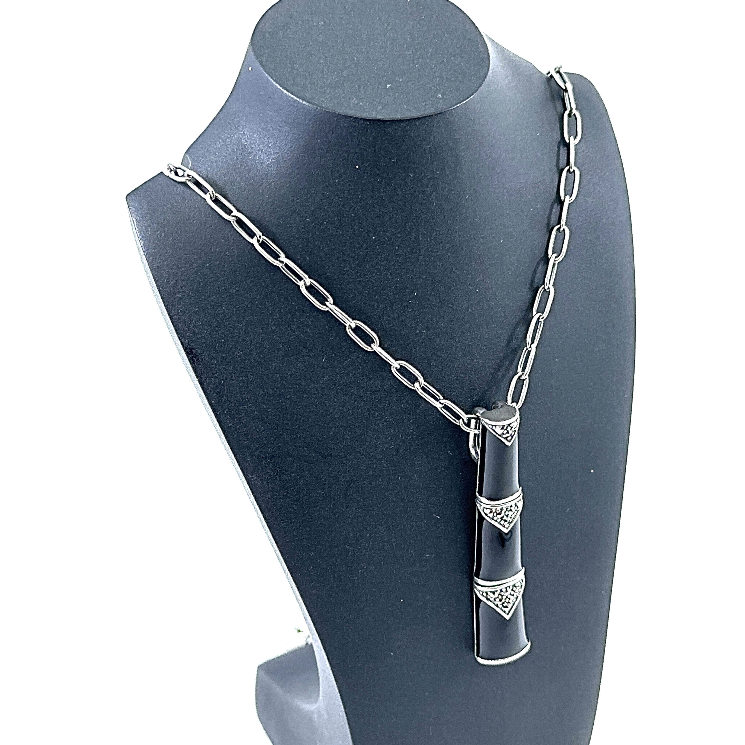 Black enamel detailing is contrasted with marcasite accents to add depth and surface interest. The bamboo motif introduces a subtle architectural rhythm, giving the pendant a distinctive character without excessive ornamentation.