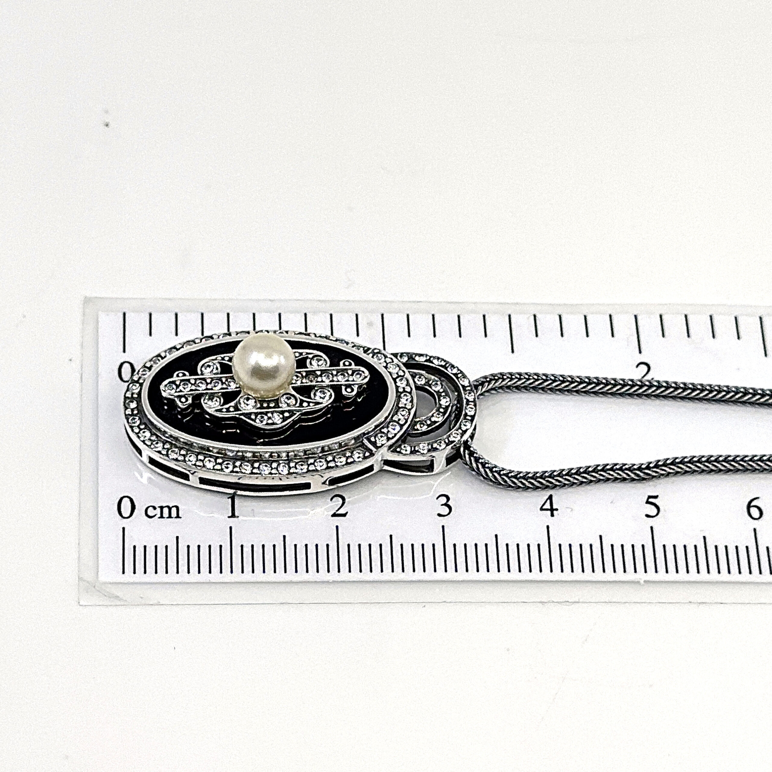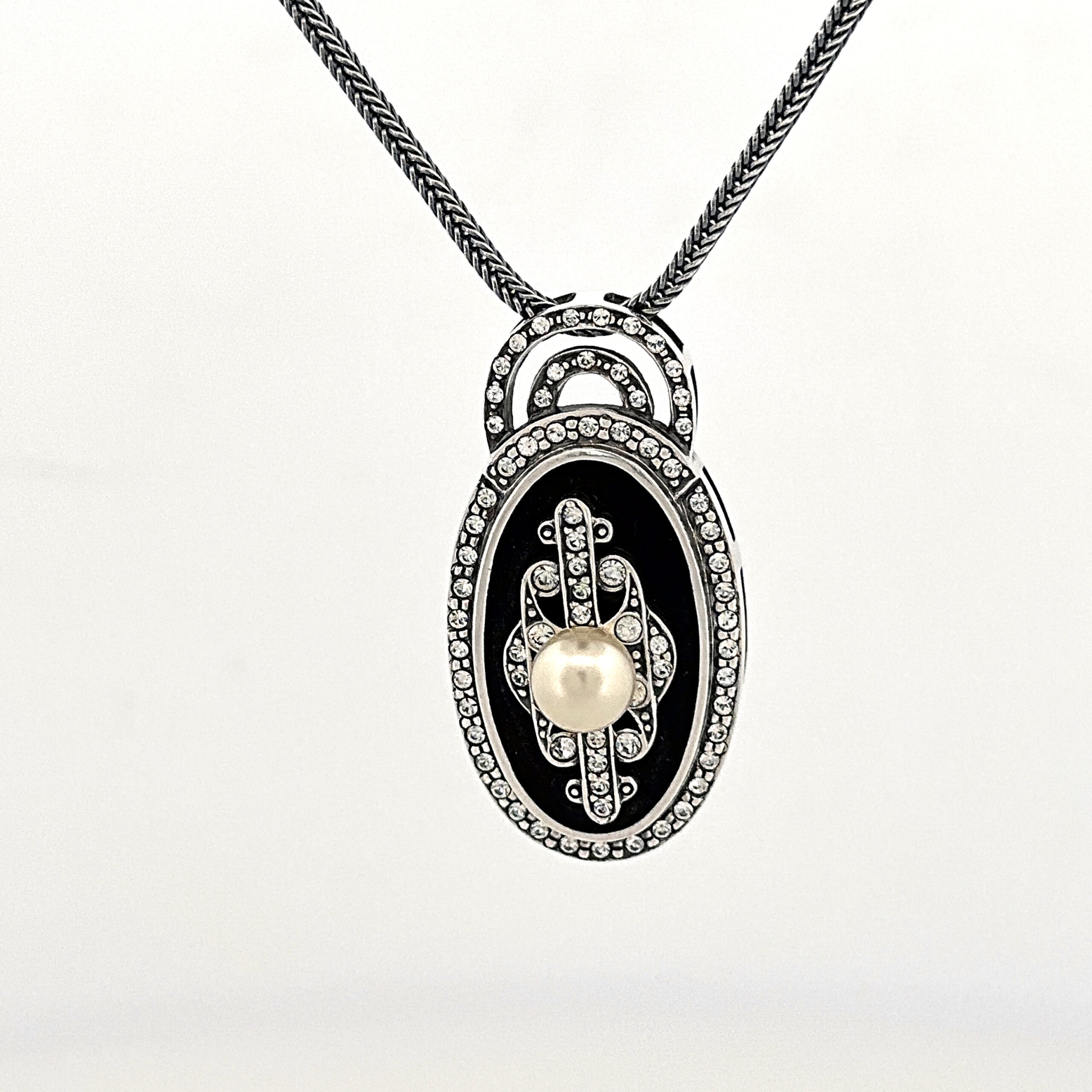 This necklace is designed around an Art Deco–inspired pendant combining black enamel, a central pearl, and crystal detailing, suspended from a fine chain for wear at the neckline. Its primary function is decorative, presenting a structured composition influenced by early twentieth-century geometric design.