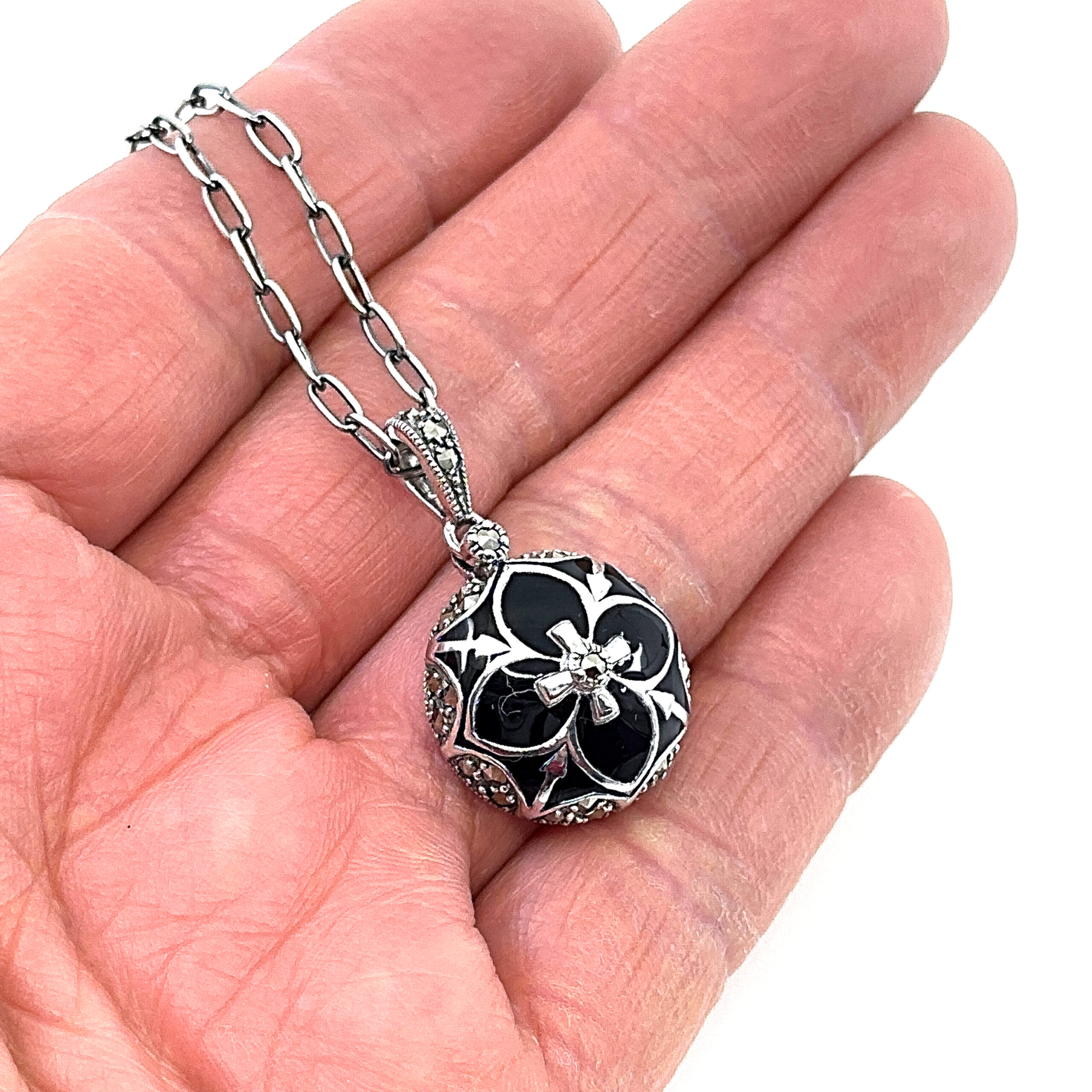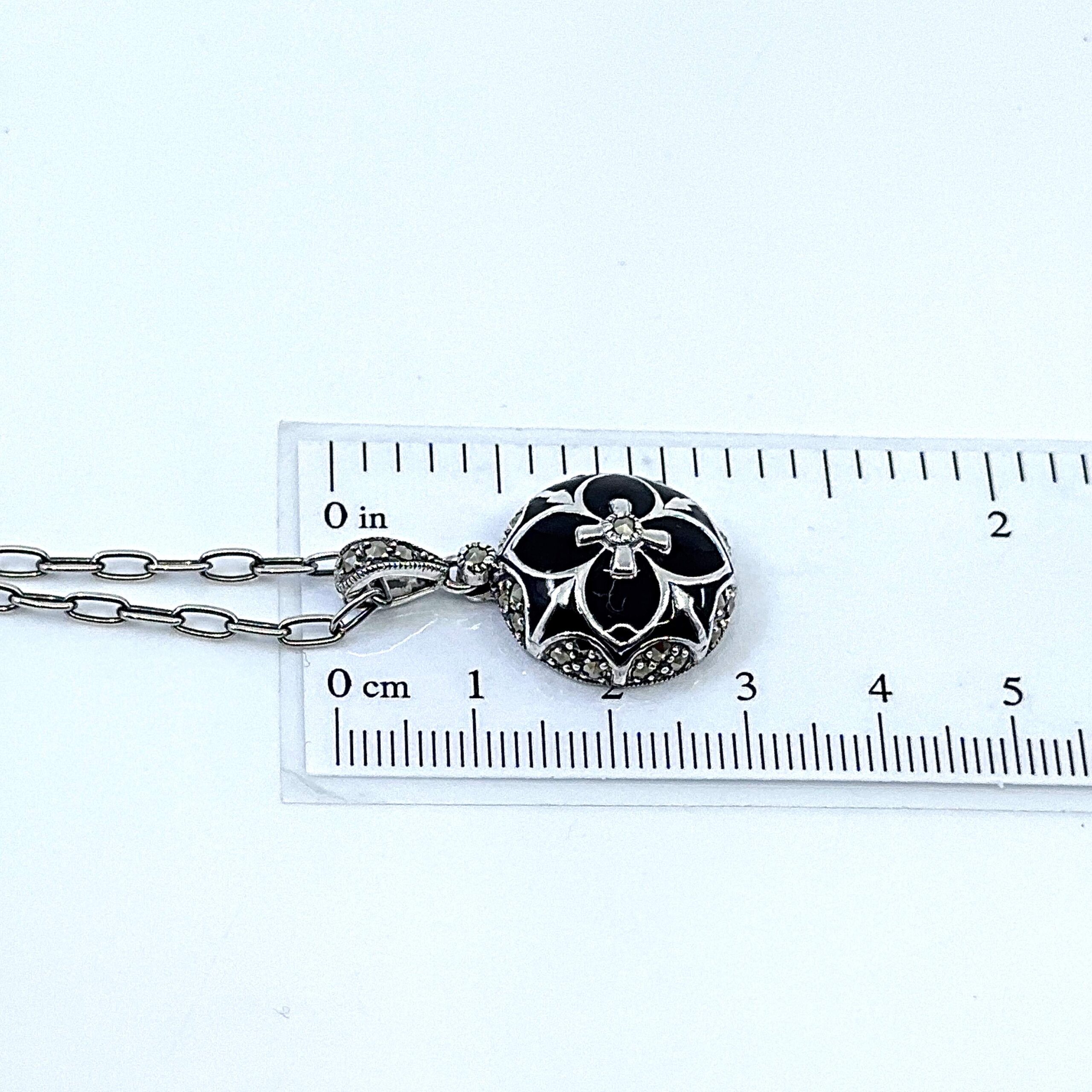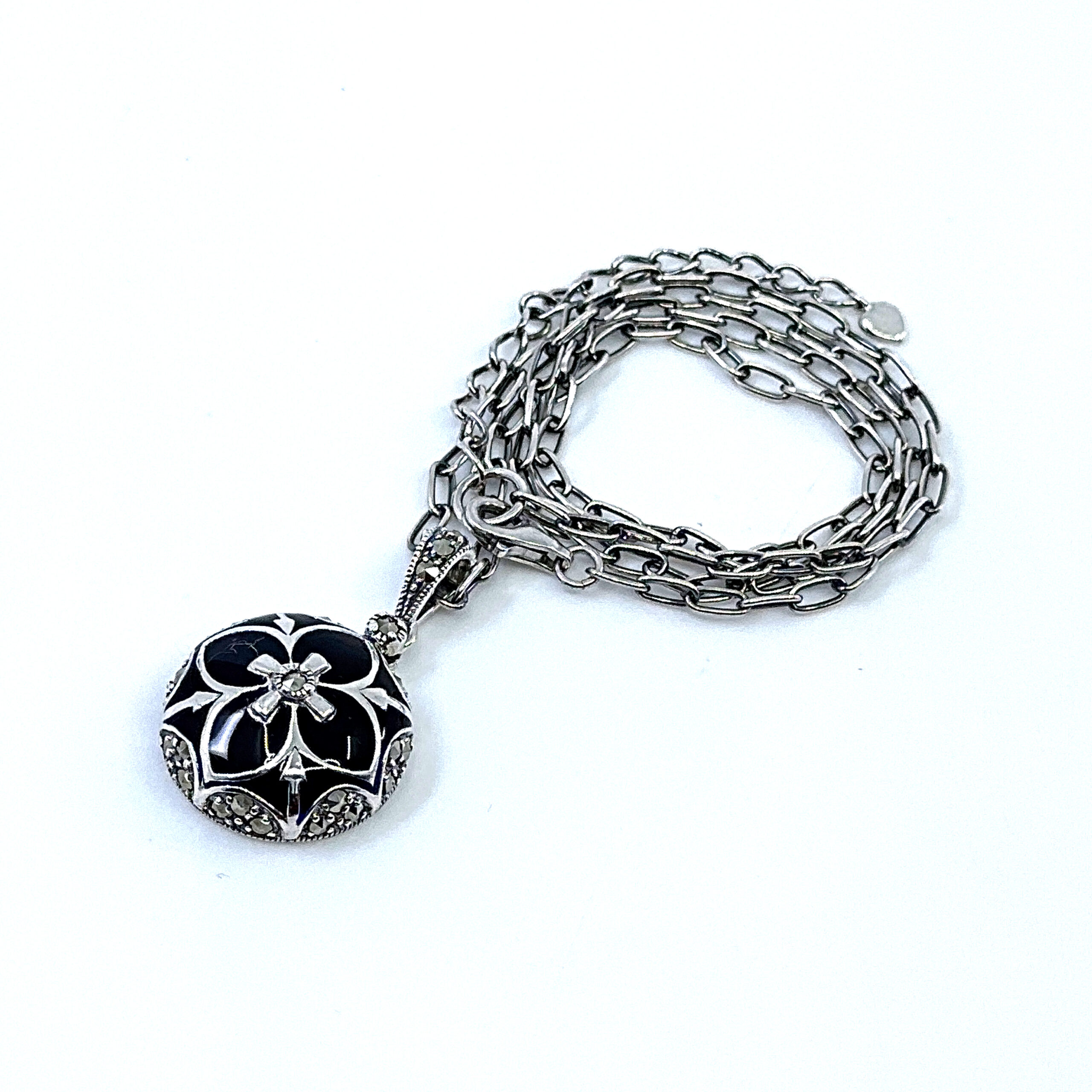 This piece is handcrafted using traditional silversmithing techniques, with careful attention given to the setting of the marcasite and the application of the enamel. The pendant is precisely finished, and the chain selected to complement the scale and weight of the design for balanced wear.