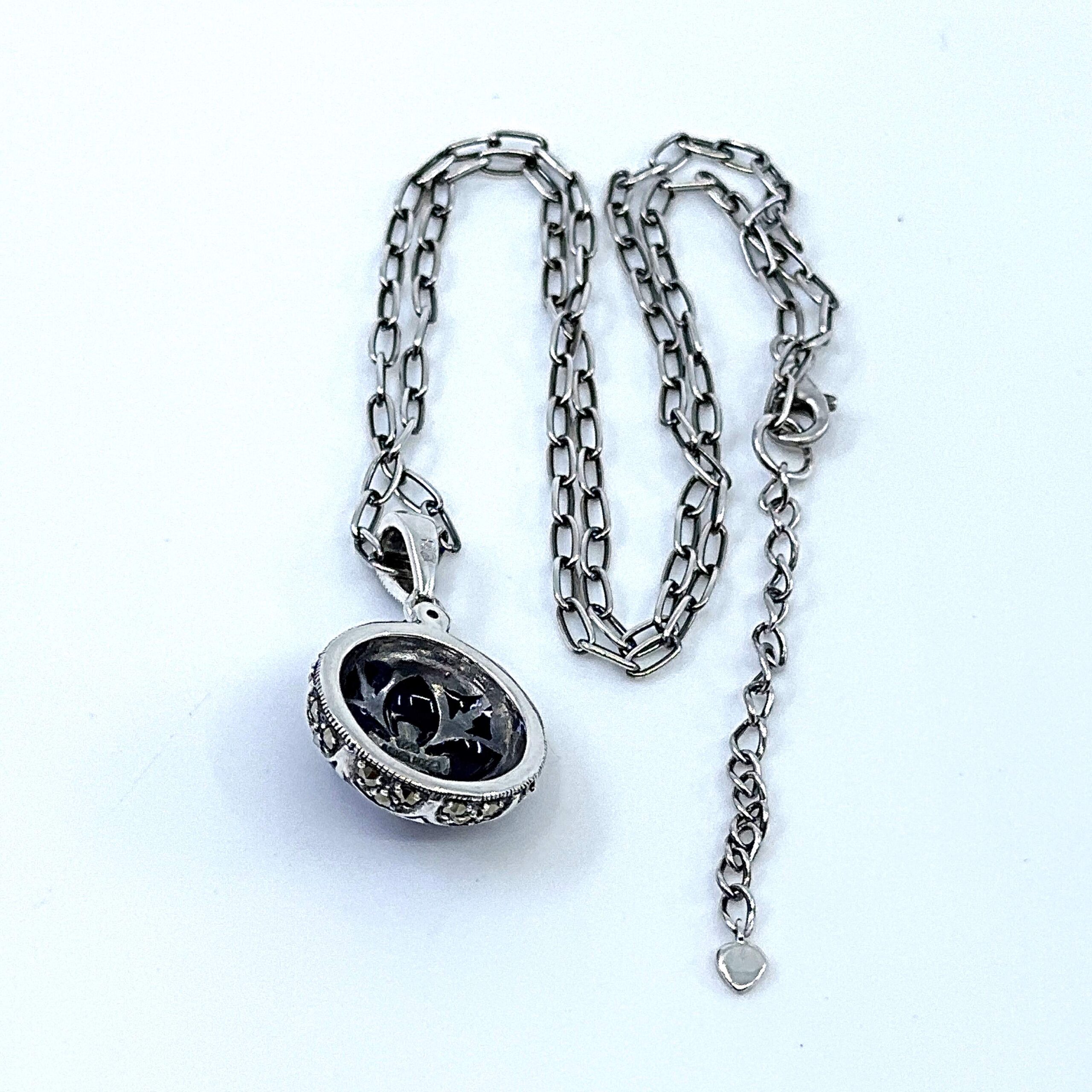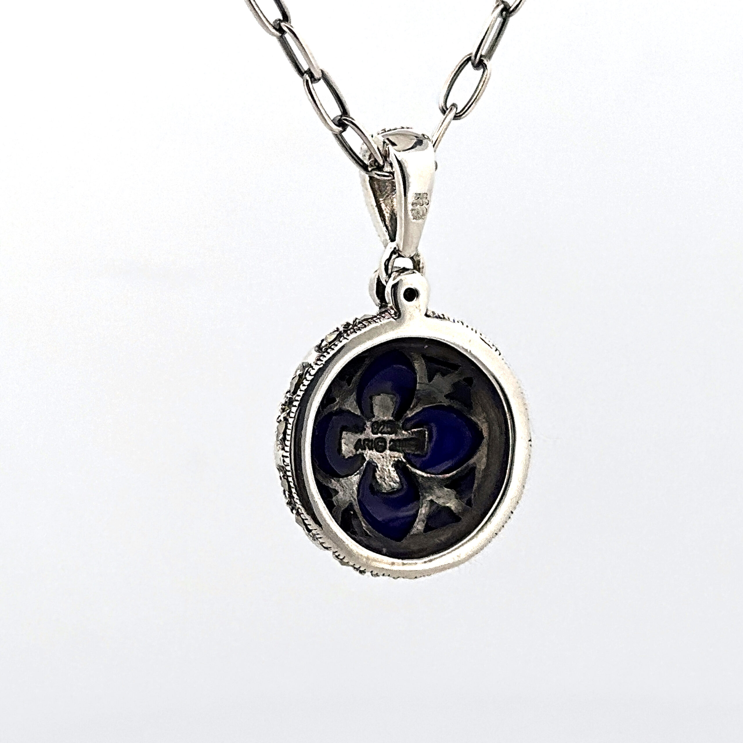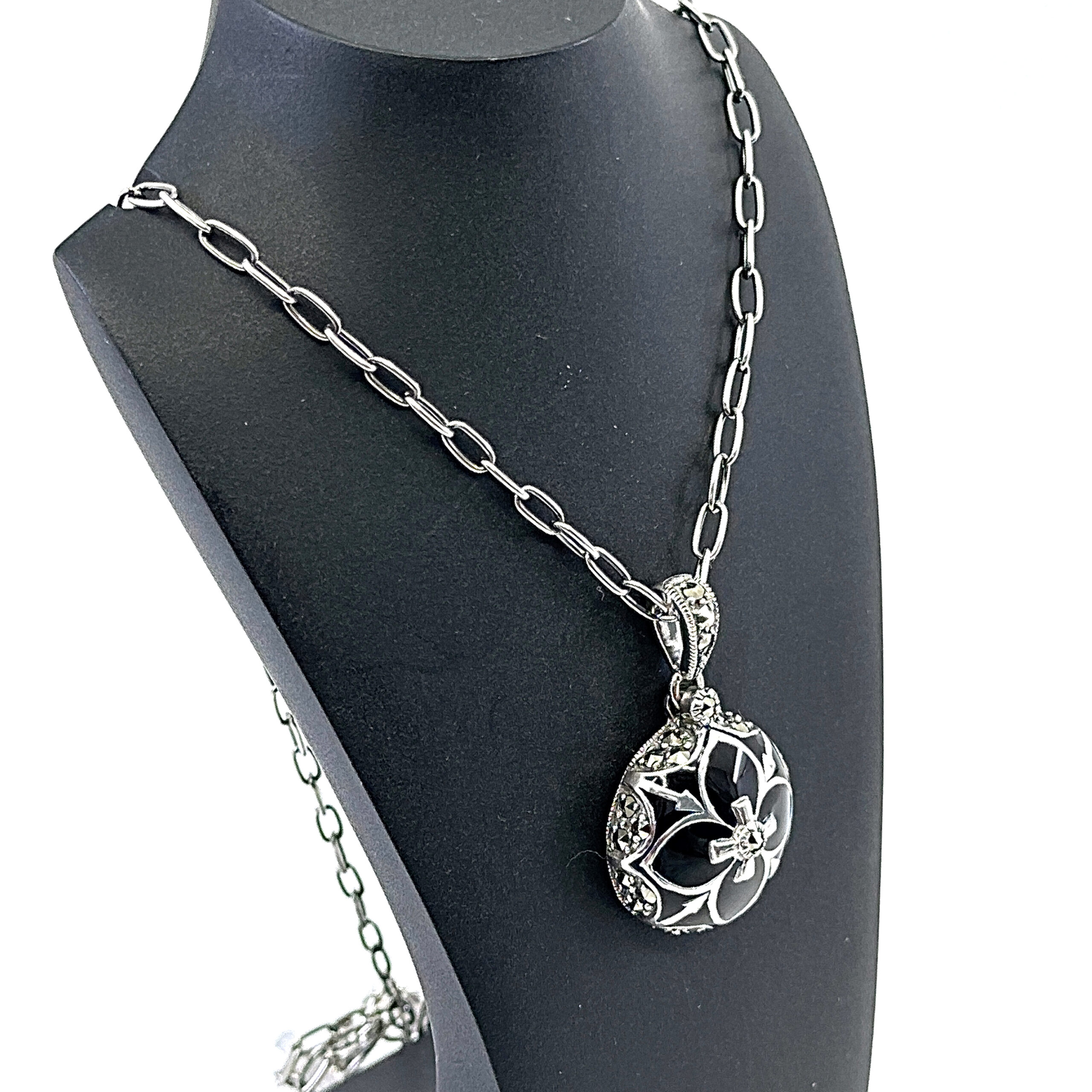 This piece is handcrafted using traditional silversmithing techniques, with careful attention given to the setting of the marcasite and the application of the enamel. The pendant is precisely finished, and the chain selected to complement the scale and weight of the design for balanced wear.
