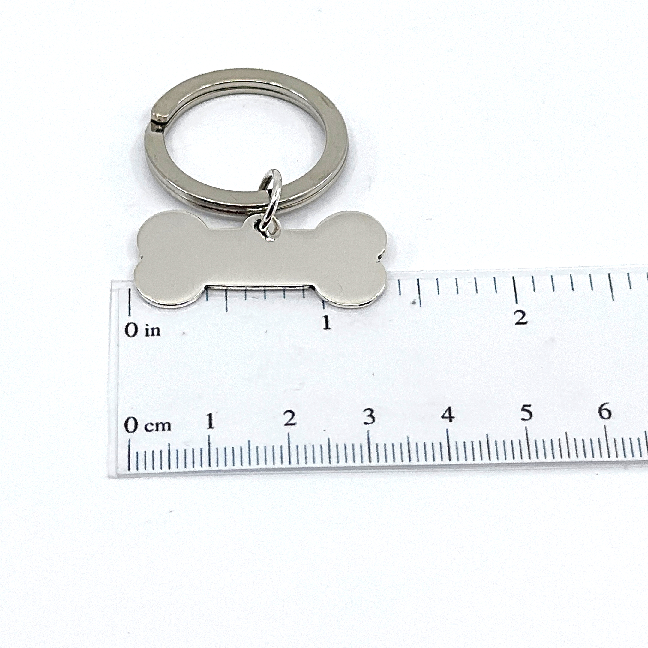 This collar tag keyring is shaped as a simple bone form and designed for use as either a pet identification tag or a compact keyring. The primary function is to carry engraved identifying information while remaining securely attached via a small ring fitting.
