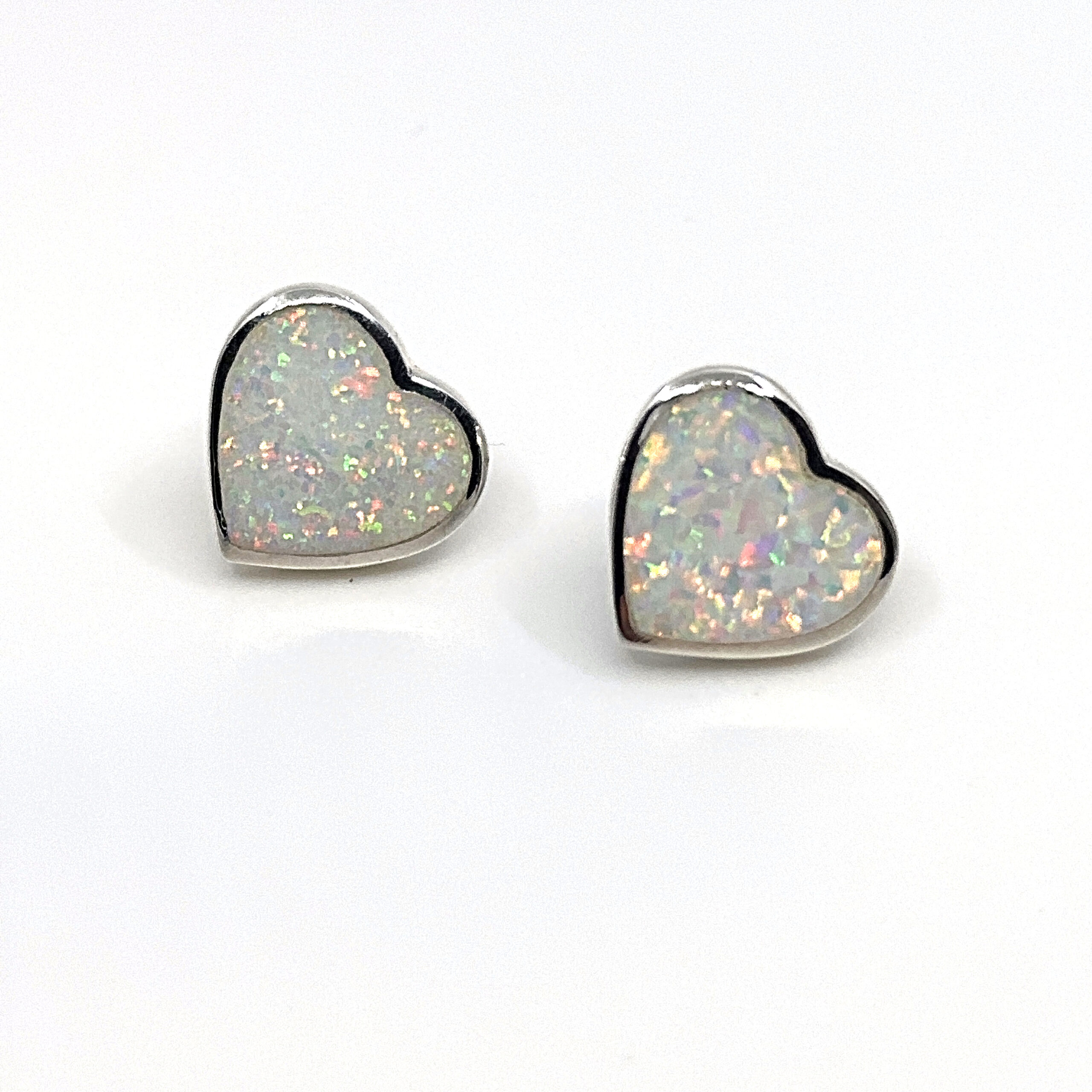 Heart Shaped Stud Earrings With White Crushed Opal Resin Detail Finished In 925 English Hallmarked Sterling Silver