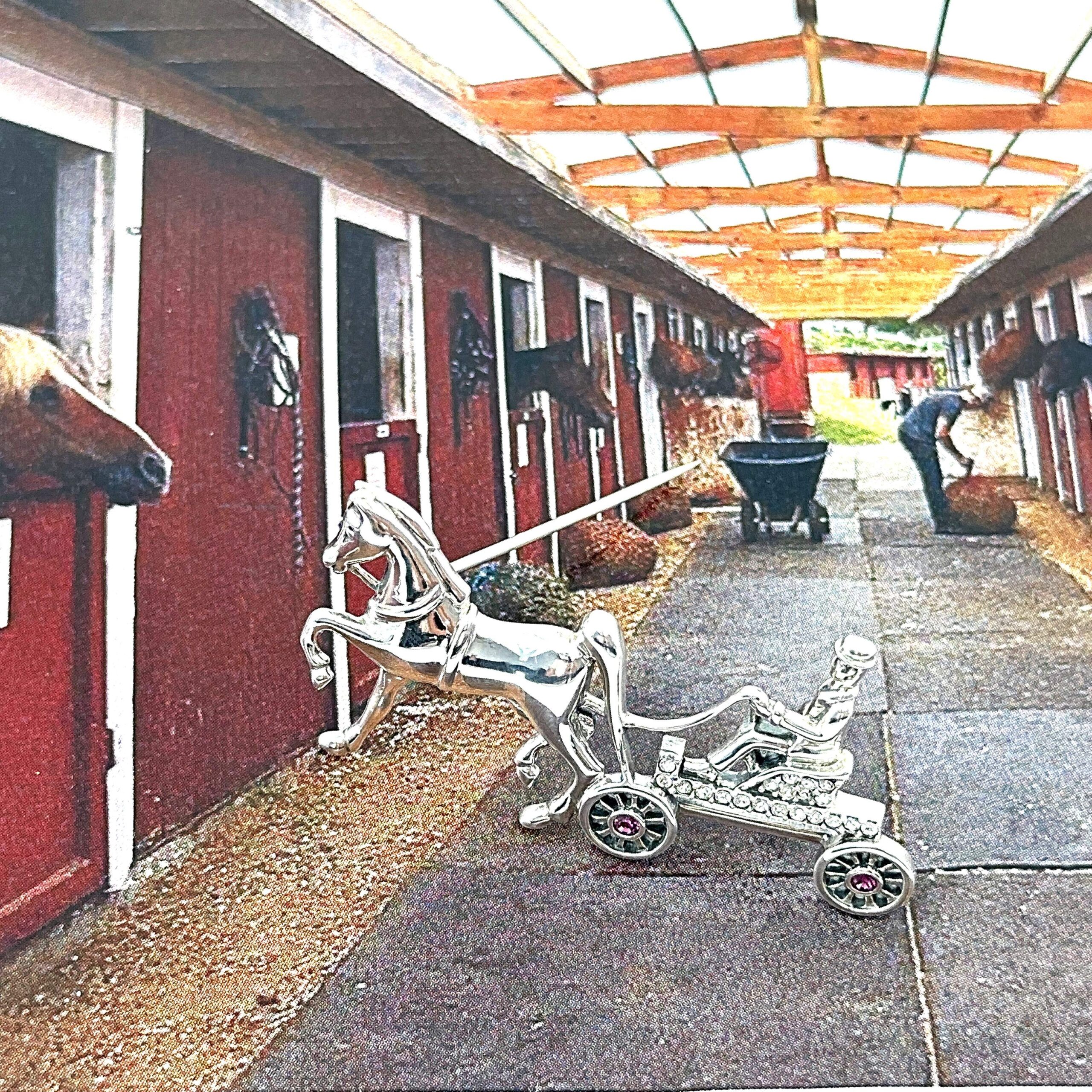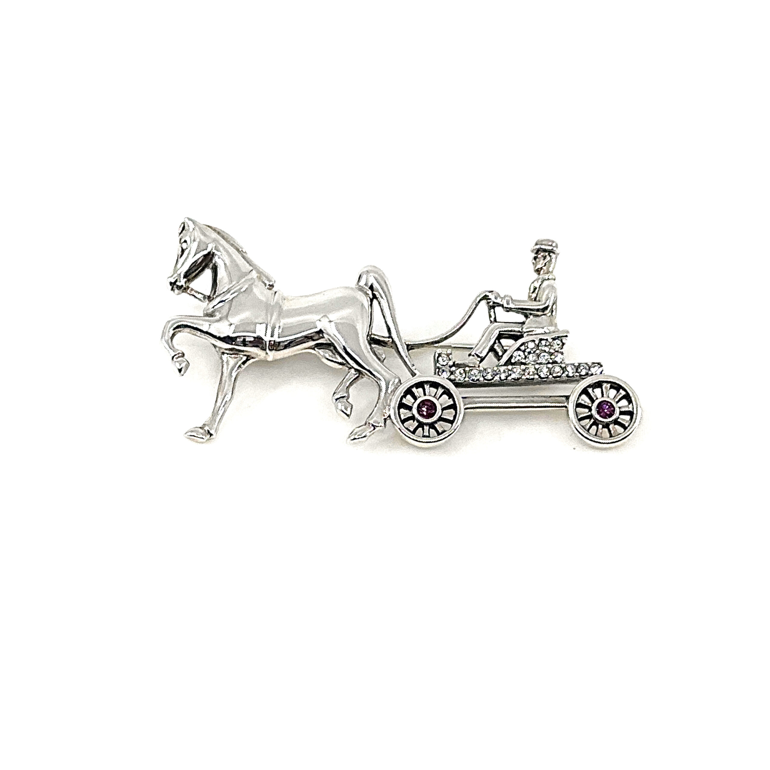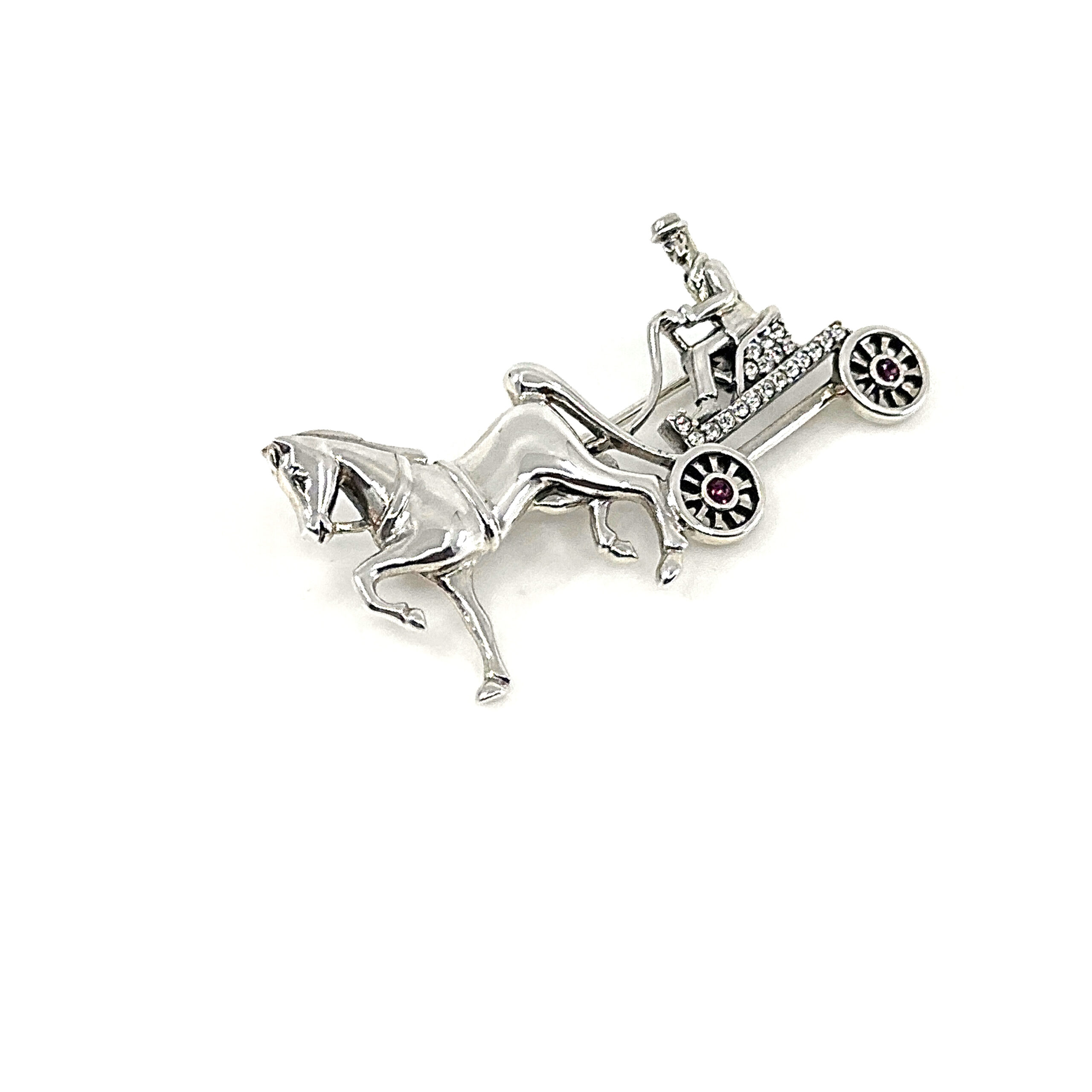 This brooch depicts a horse and carriage scene, composed with attention to proportion and detail to create a balanced and clearly defined design. The arrangement captures both the structure of the carriage and the movement of the horse within a compact and decorative form.