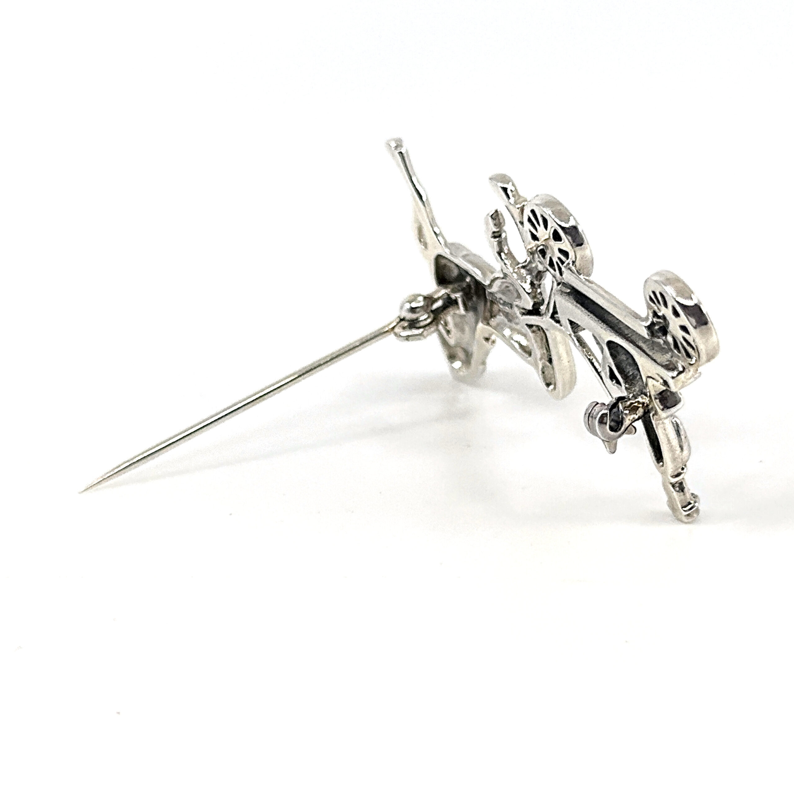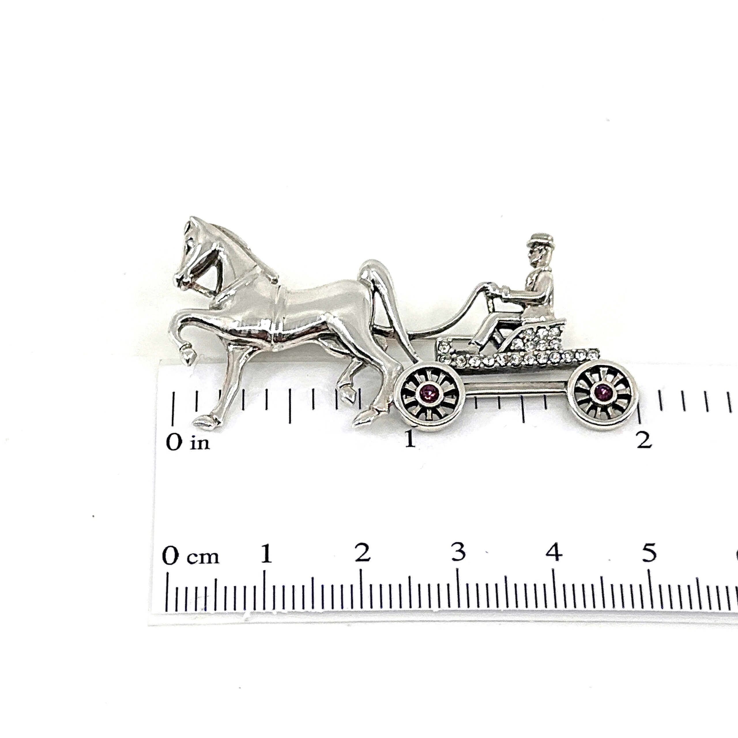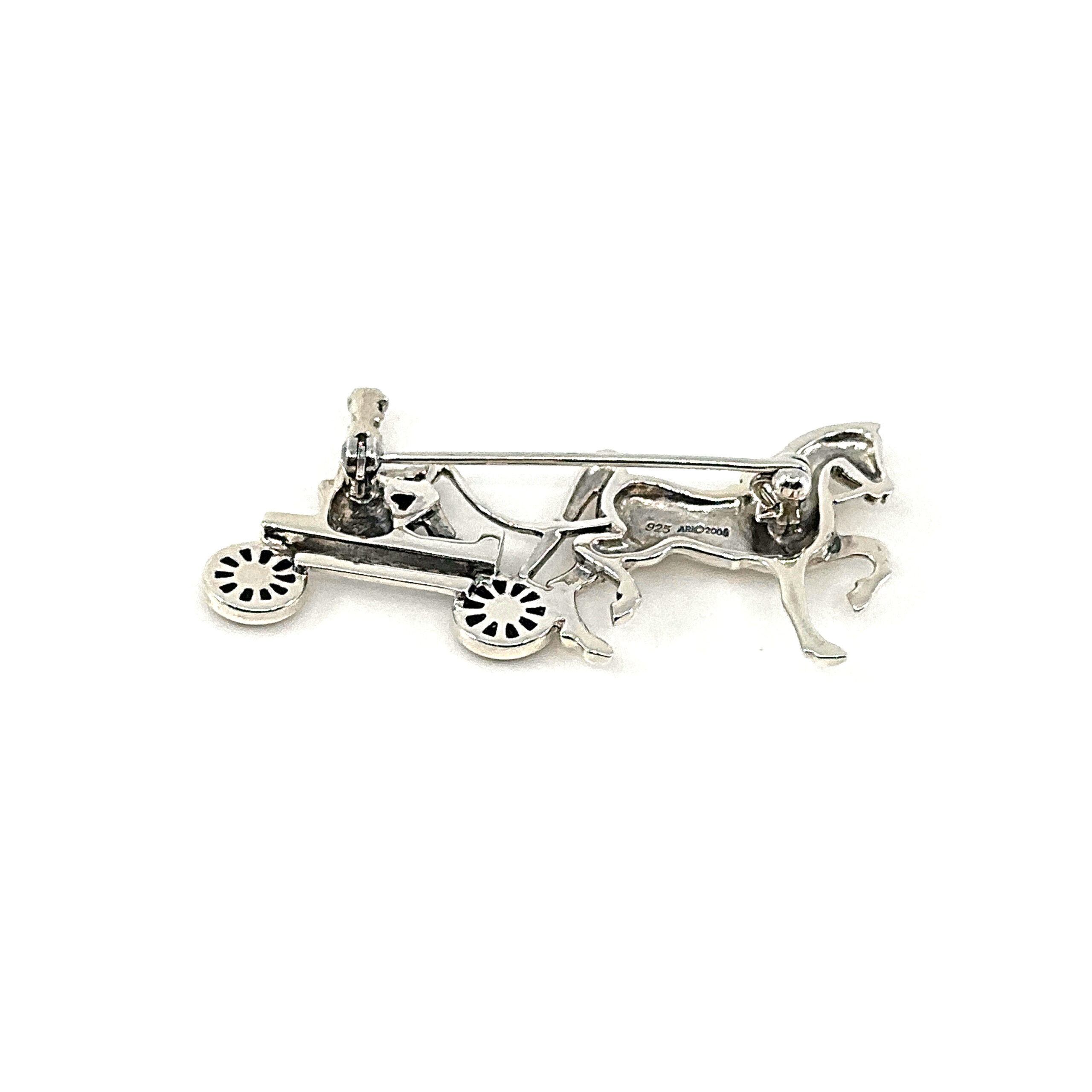 This brooch depicts a horse and carriage scene, composed with attention to proportion and detail to create a balanced and clearly defined design. The arrangement captures both the structure of the carriage and the movement of the horse within a compact and decorative form.