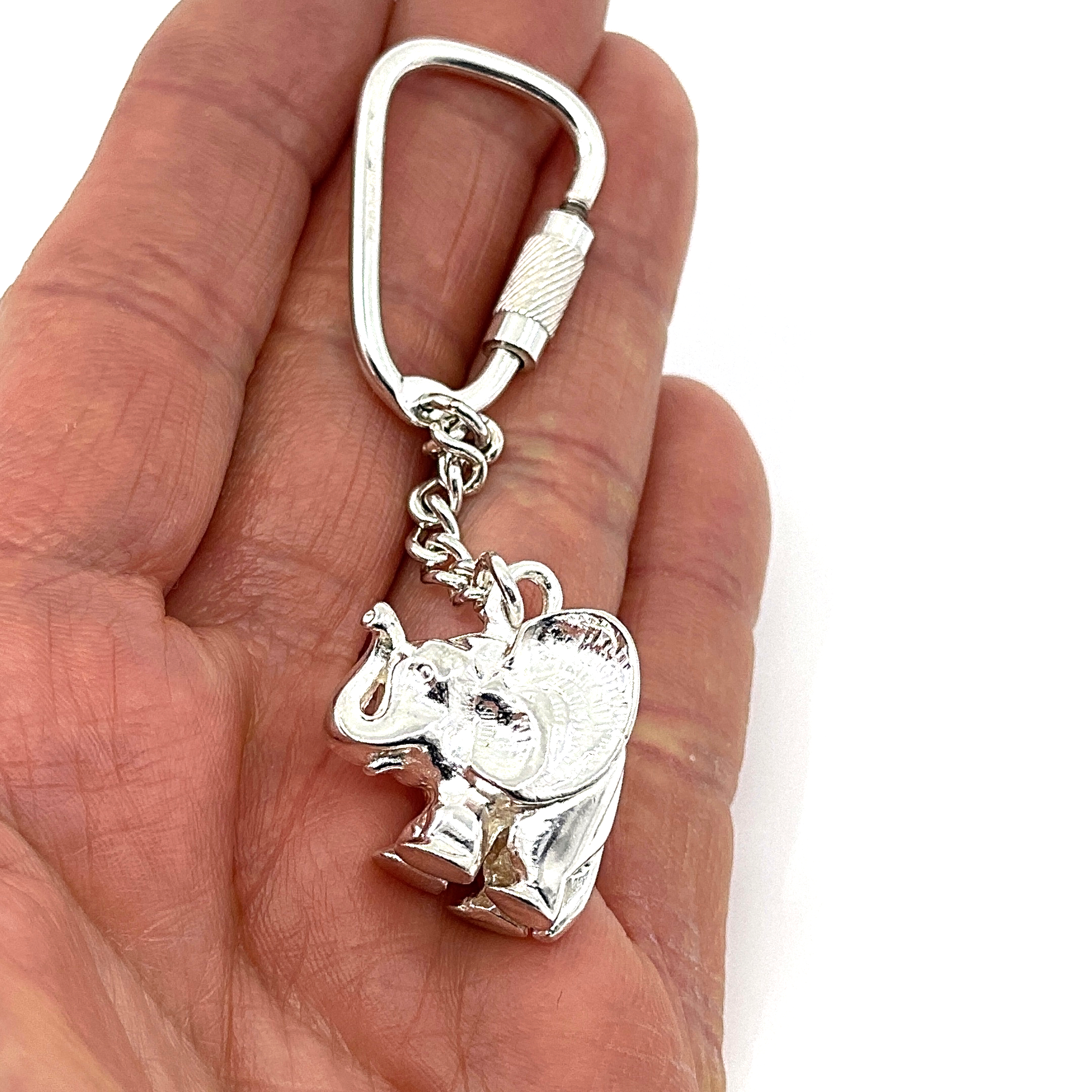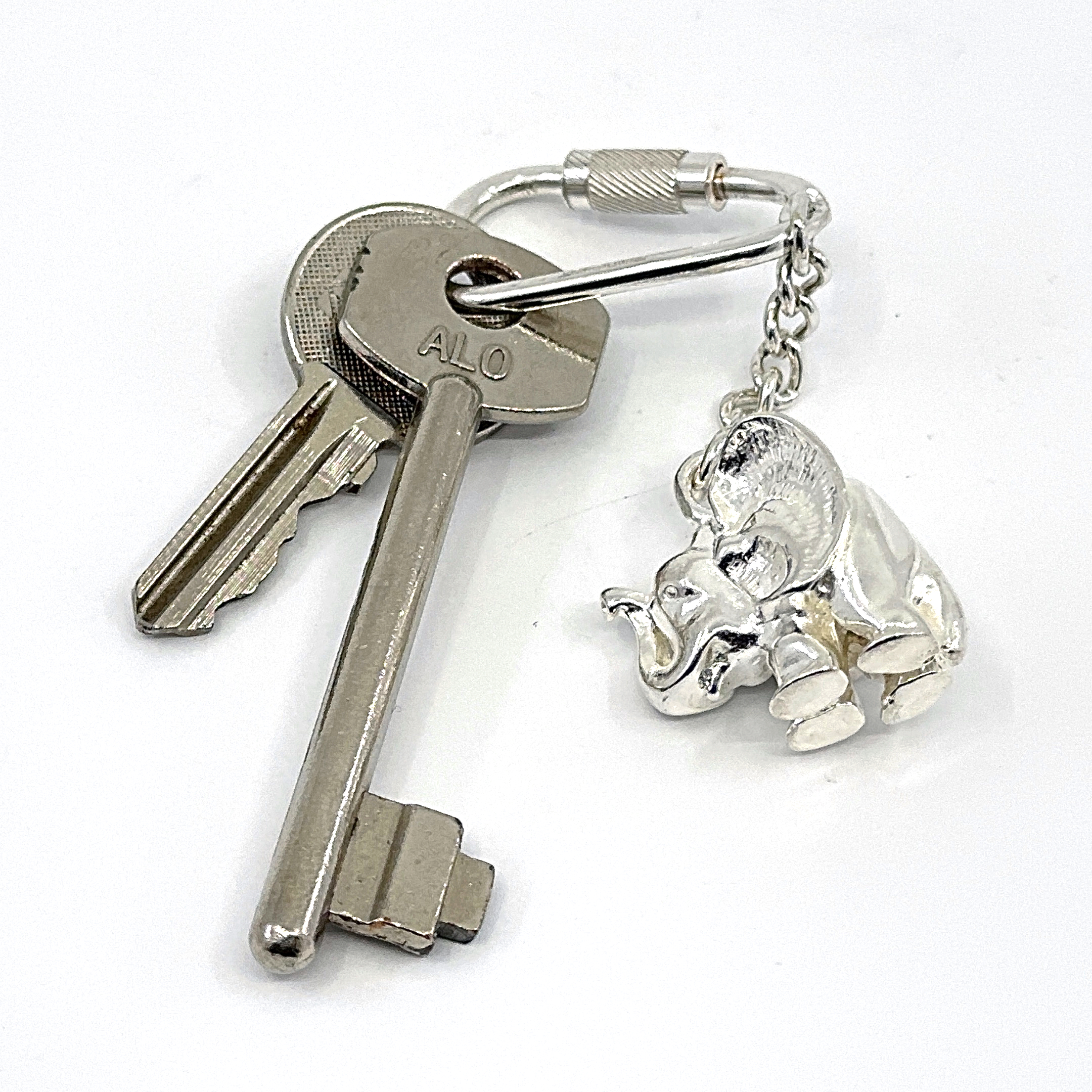 This keyring is formed as a compact elephant figure and fitted with a screw-thread mechanism that allows keys to be added or removed securely. Its primary function is to organise keys while presenting a clearly defined animal form within a restrained, practical design.