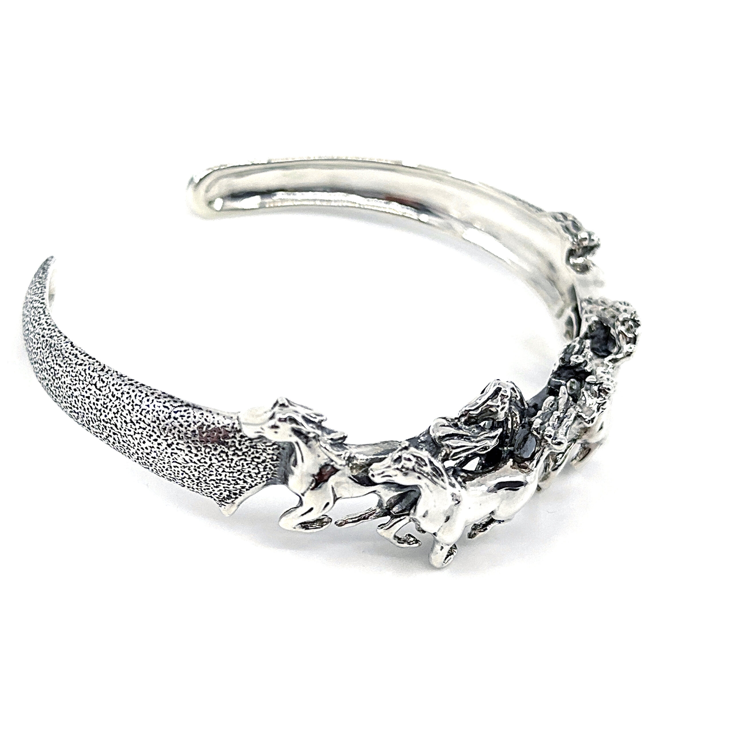 This bangle features a series of galloping horses arranged along the upper section, creating a sense of movement across a structured circular form. The composition captures the energy and rhythm of the horses while maintaining a balanced and clearly defined silhouette.