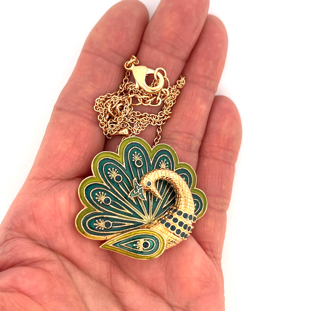 Celebrated for its symbolism of beauty and renewal, this peacock pin brooch pendant presents a richly detailed bird motif with elegant presence. The sweeping form and layered plumage are enhanced with multi-coloured enamel, creating depth and visual movement. Designed to be worn either as a brooch or as a pendant, the piece offers versatility while retaining a refined, decorative character inspired by classic animal jewellery.
