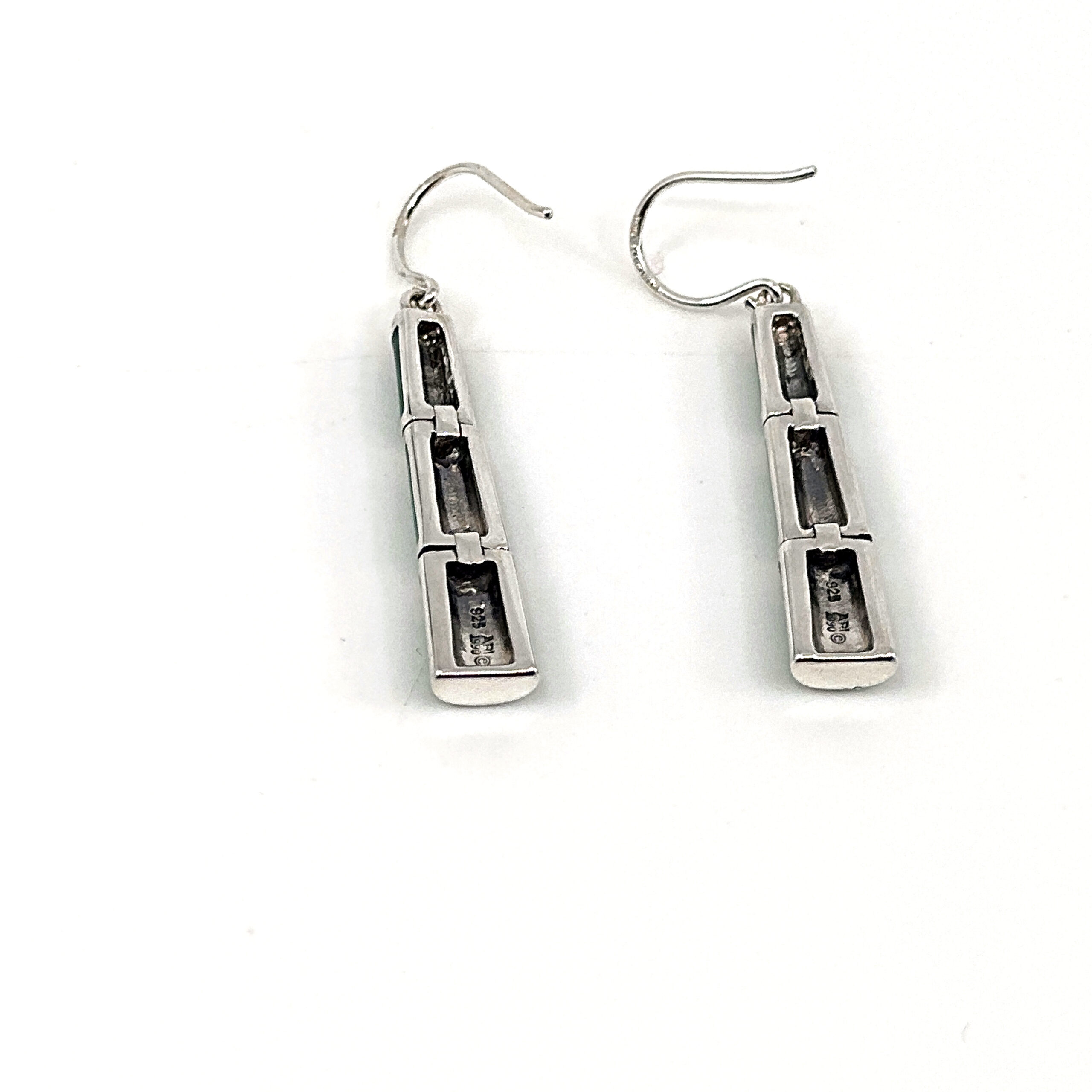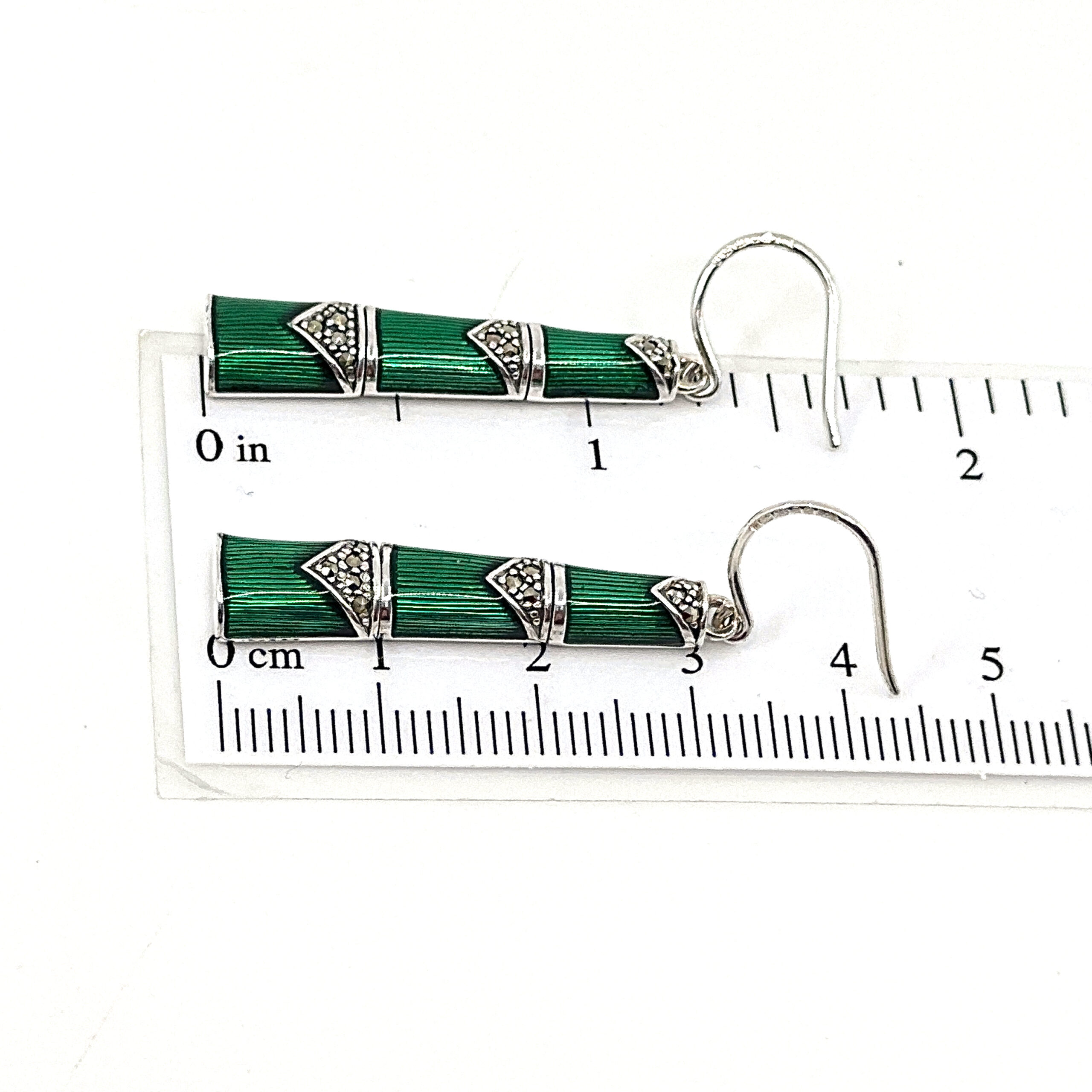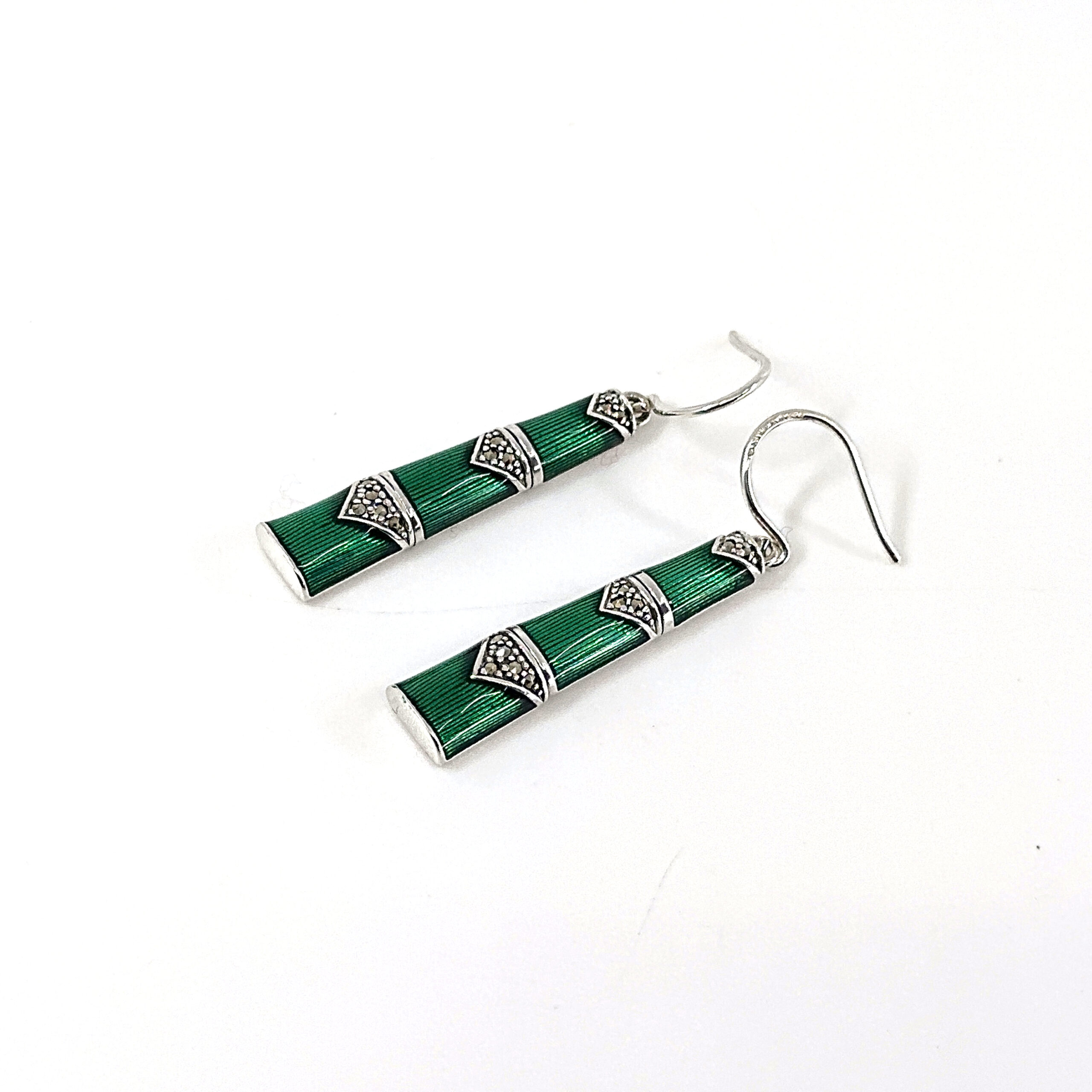 Green enamel introduces a vivid contrast along the segmented sections, while marcasite detailing adds texture and definition. The drop format enhances movement, resulting in a refined and well-proportioned design.