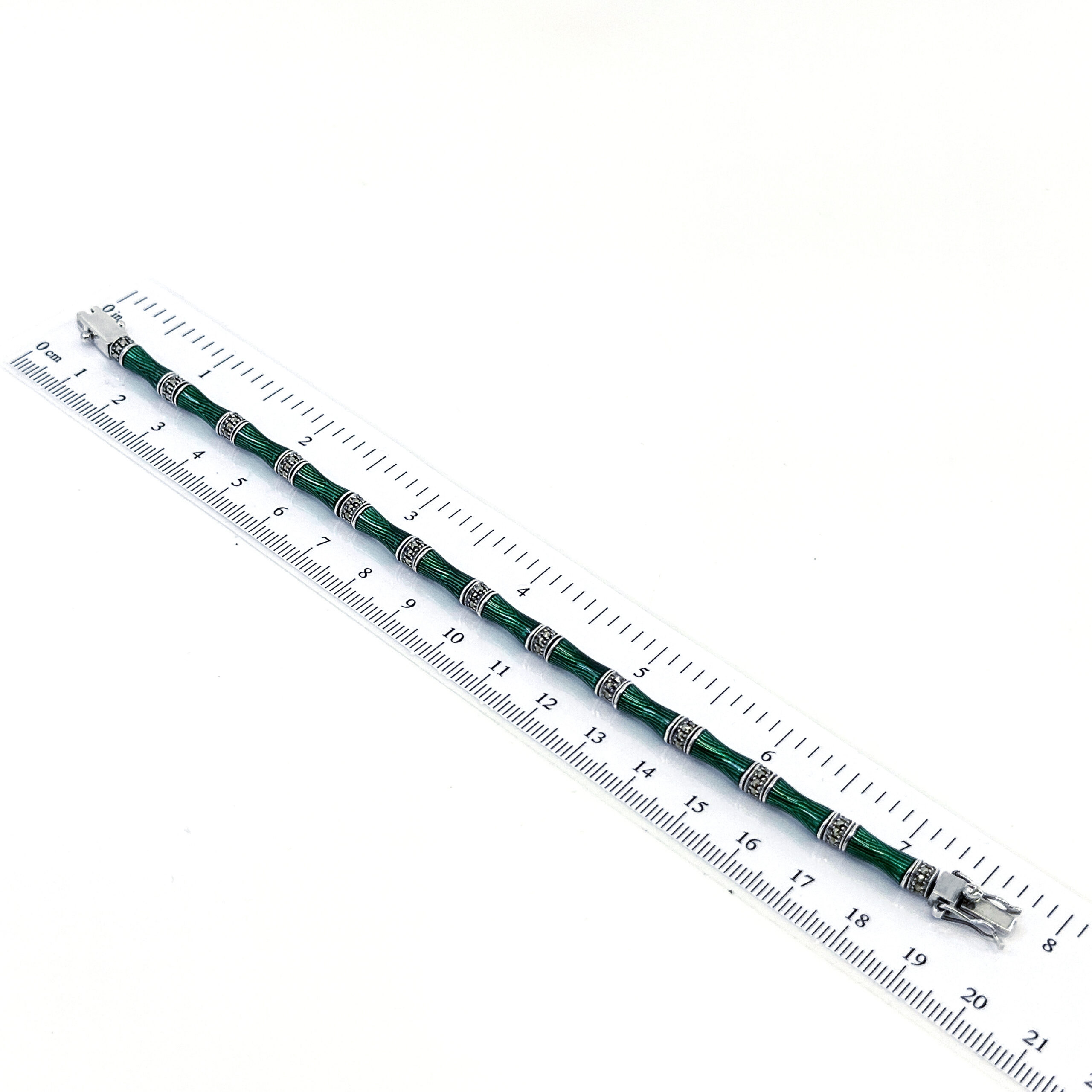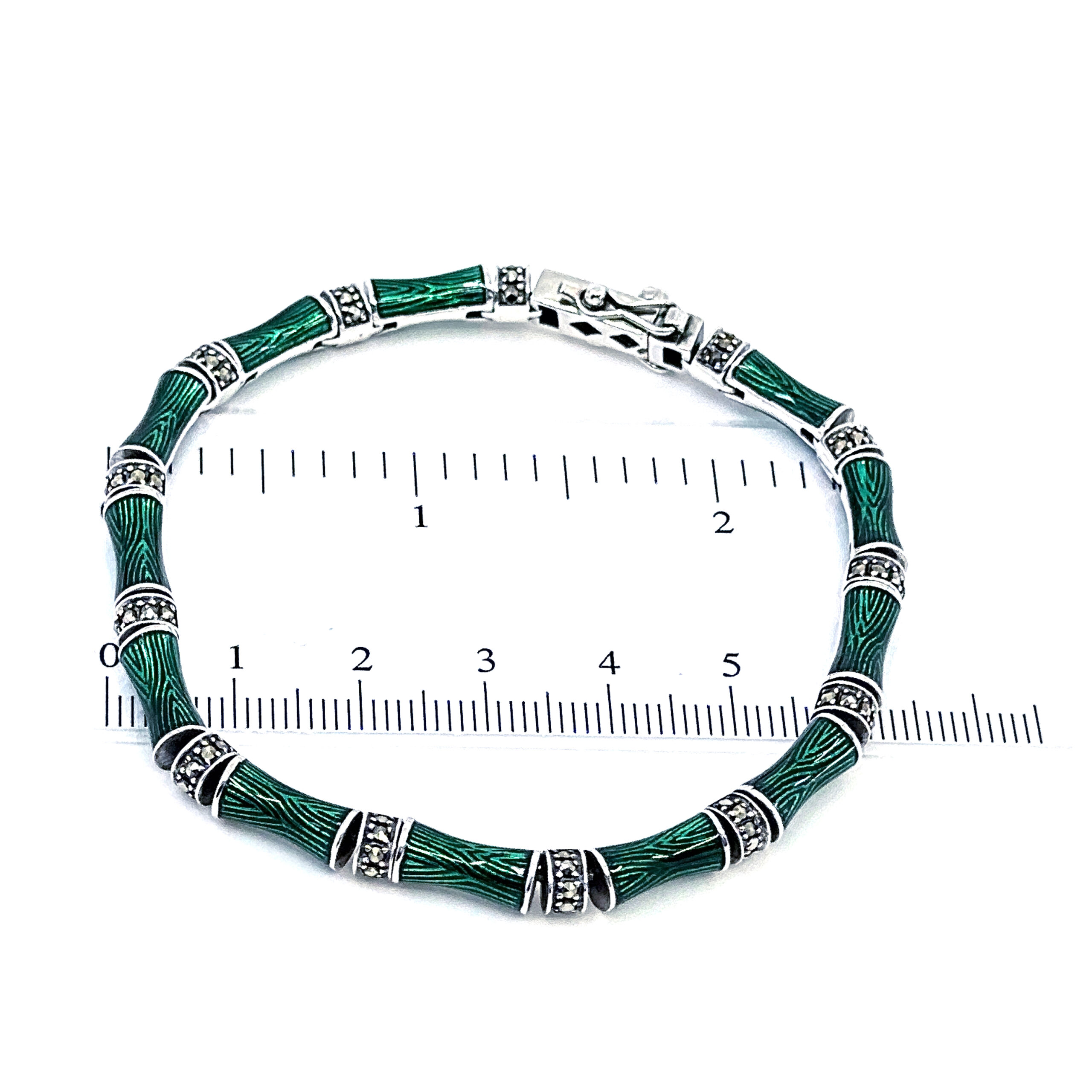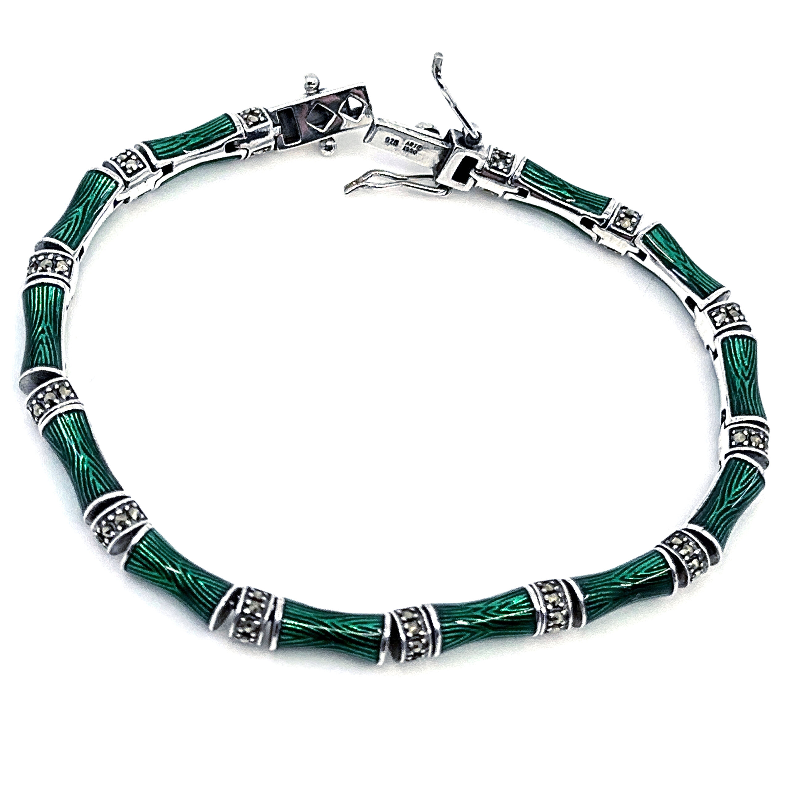 Crafted in England from 925 sterling silver and bearing English hallmarks, this bracelet reflects a tradition of skilled workmanship and careful finishing. The enamel is applied with precision to achieve depth and consistency of colour, while each marcasite stone is individually set to ensure durability and balance.